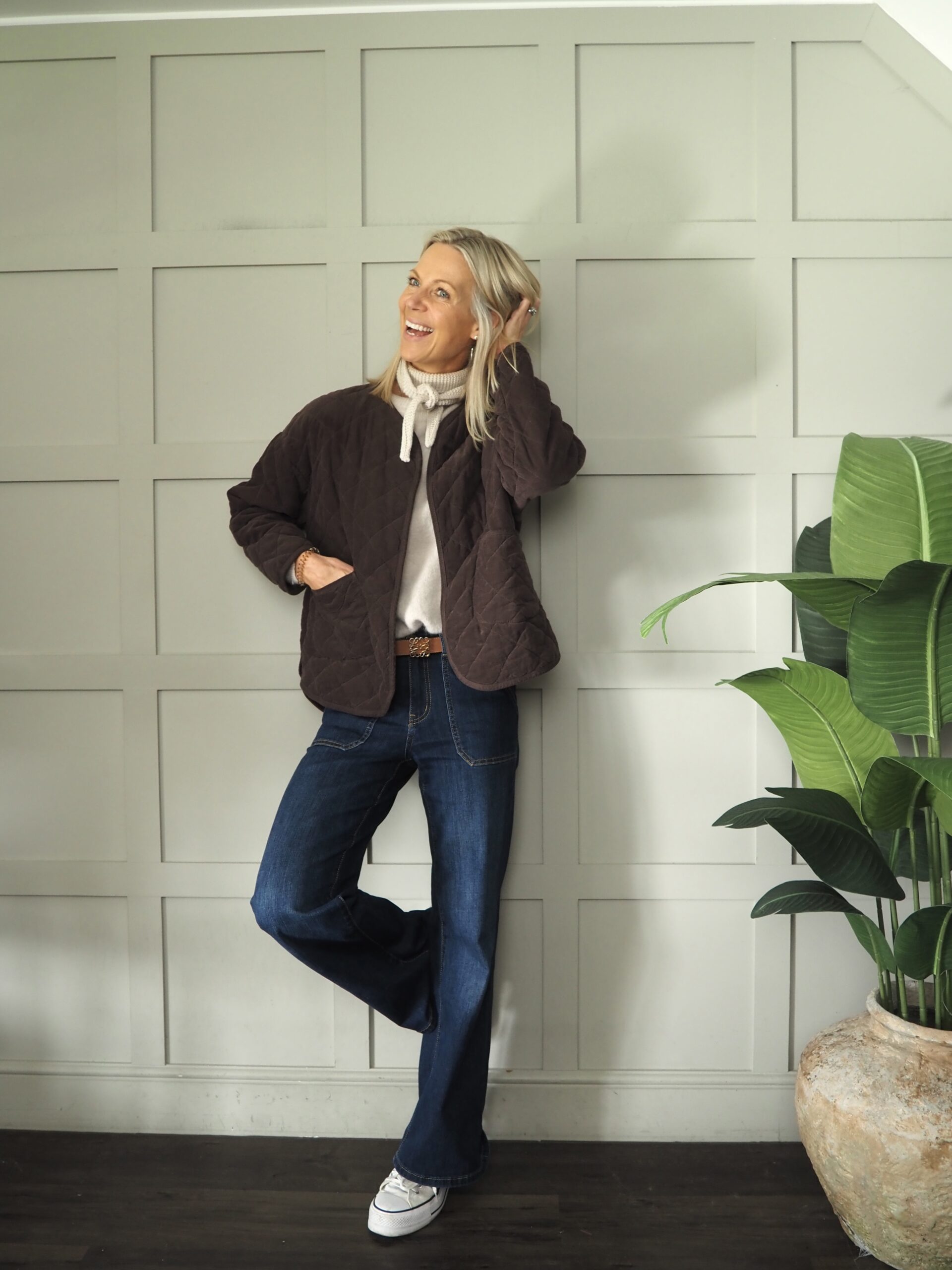 This cotton, needlecord quilted jacket is a casual, chic piece for the autumn. It works perfectly layered over a knit and worn with jeans or a skirt. It is a relaxed fit and is comfortable to wear. It has a round collar, pockets at the front and side splits. The hem is longer at the back giving a flattering silhouette.