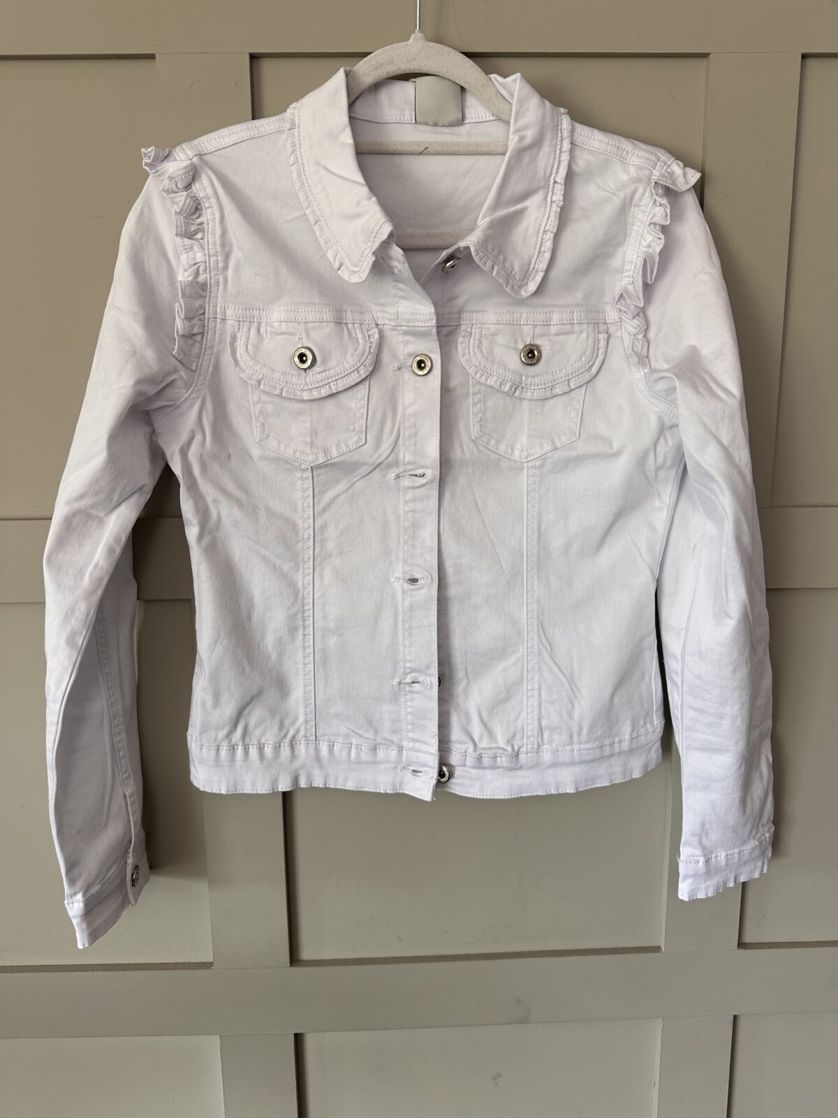 The Raliella denim jacket has little ruffles on the collar, shoulders and the front pockets. Button fastening to the front and single button on each cuff.