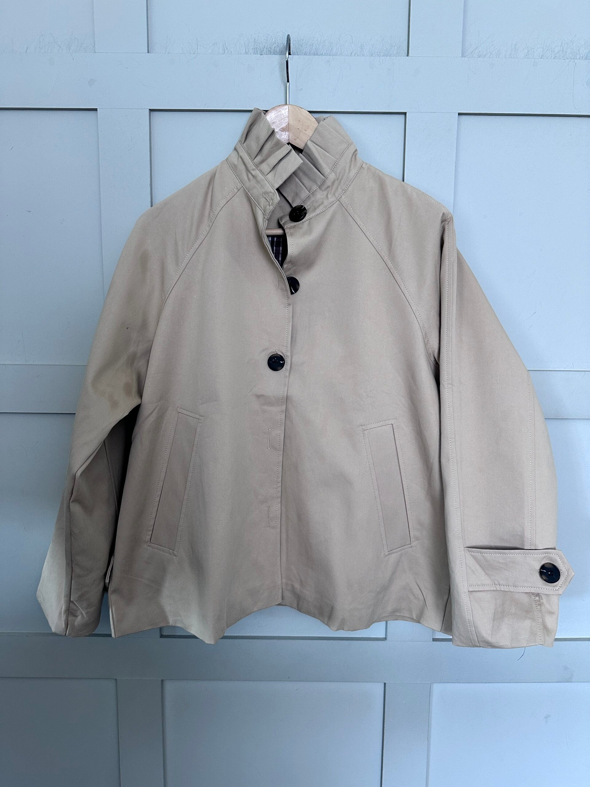 This chic jacket is a fantastic addition to your autumn/winter wardrobe. It has a lovely checked lining and an elegant high pleated collar which adds femininity. It has full length sleeves with cuff straps, button fastenings and side pockets.