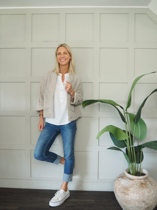 Lottie Stripe Cotton Jacket with Pockets - Navy Blue, Stone