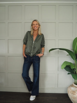 Nicola Silk Mix Short Sleeve Zip Up Bomber Jacket - Champagne, Blue, Khaki, Navy Blue, Oyster