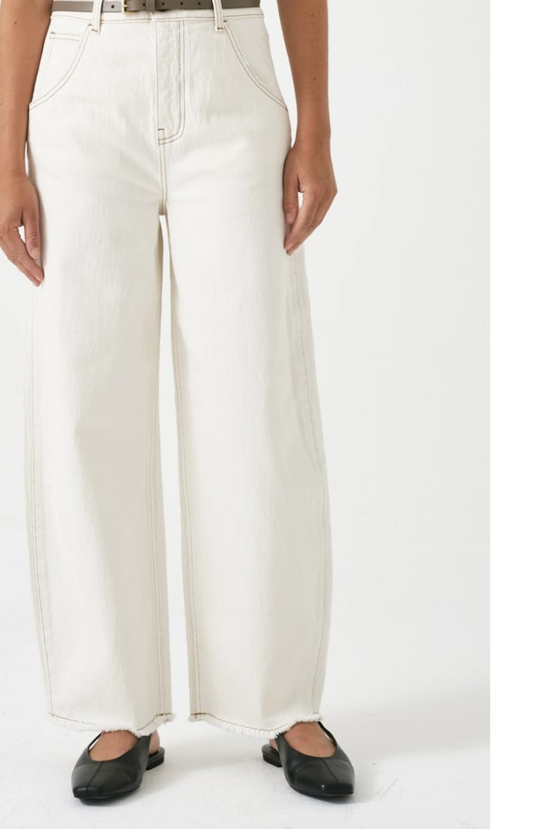 Freshen up your denim collection with these subtle barrel leg jeans. A perfect piece to add to your new season wardrobe. They work beautifully with boots but also look great with trainers or pumps so suit all seasons. Mid – high rise with a carpenter barrel leg and a frayed hem.Available in: Ecru and Vintage Steel, a washed, light grey denim.Sizing: Waist sizes 25 (UK 6-8), 26 (UK 8-10), 27 (UK 10-12), 28 (UK 12-14) and 29 (UK 14-16). Becky is a size 8-10 and 5’9” and wears the size 26.Measurements: front rise – 12.5″ / Inside leg – 26″.Composition: 94% certified organic cotton, 5% recycled cotton, and 1% eco-made elastane.