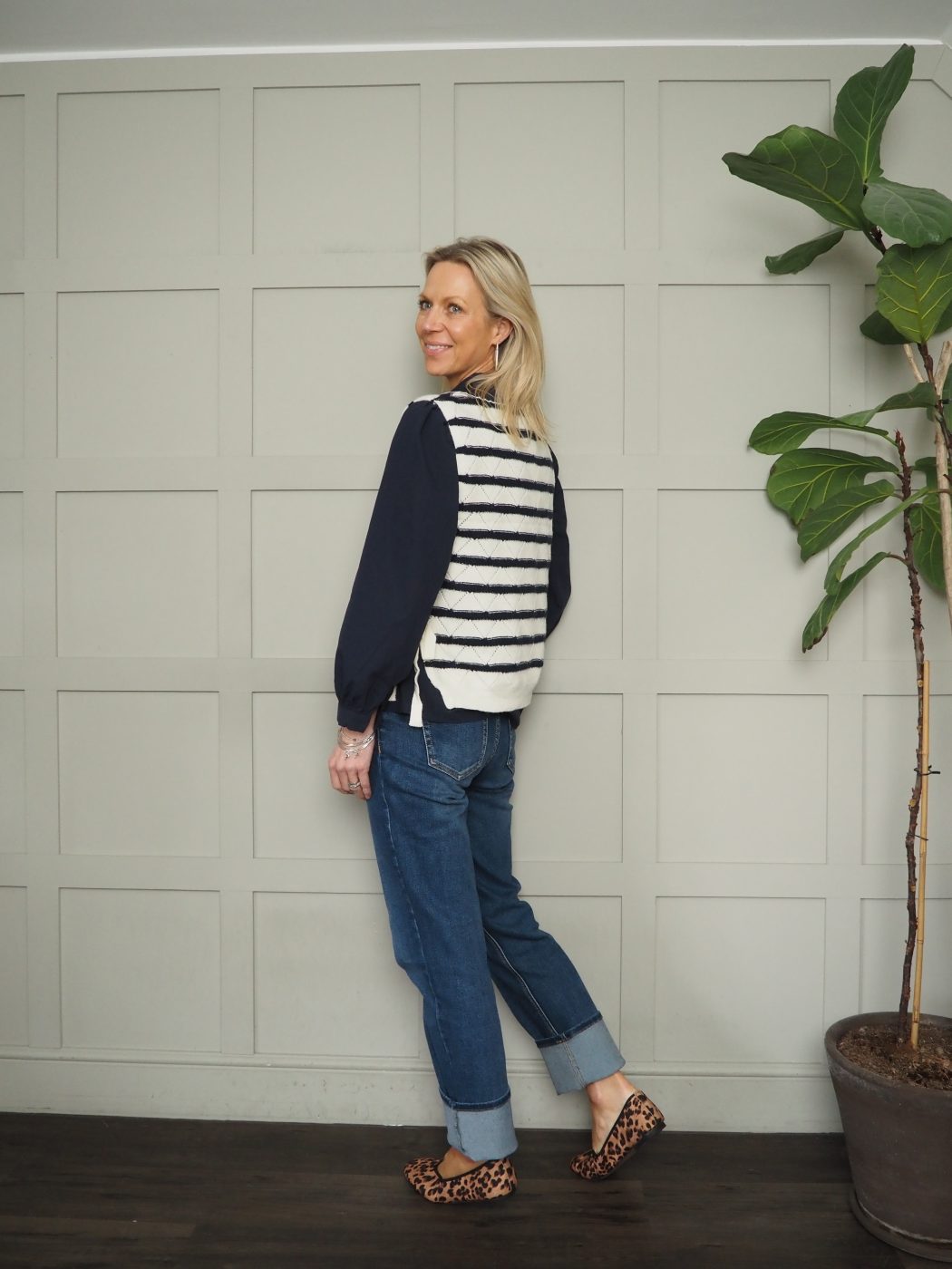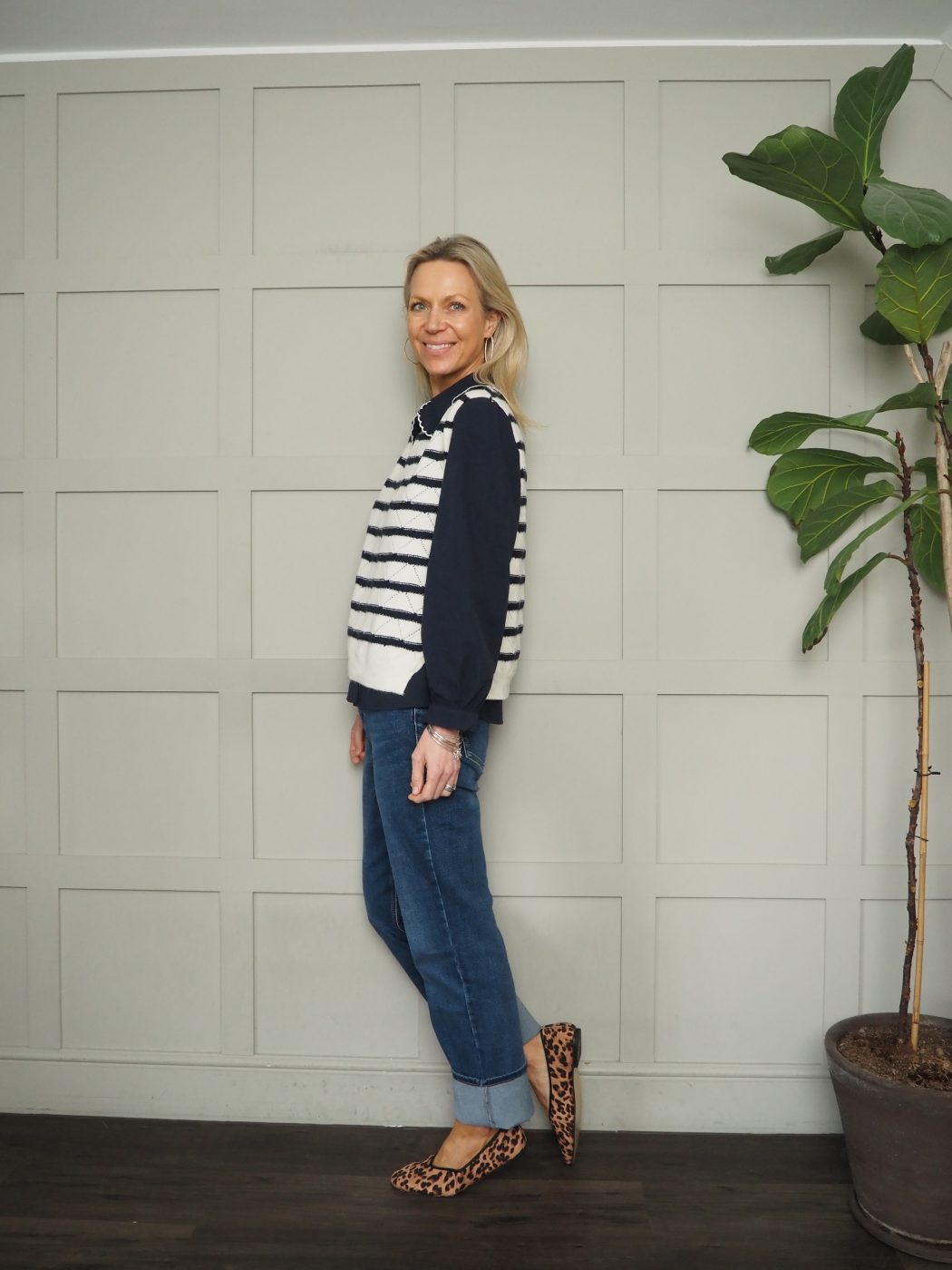 Worn with: Cerise Long Sleeve Blouse With Ruffle Detail On The Collar – Off White, Navy Blue and the Covent Straight Leg, Mid Rise Jeans – Light Denim, Mid Blue