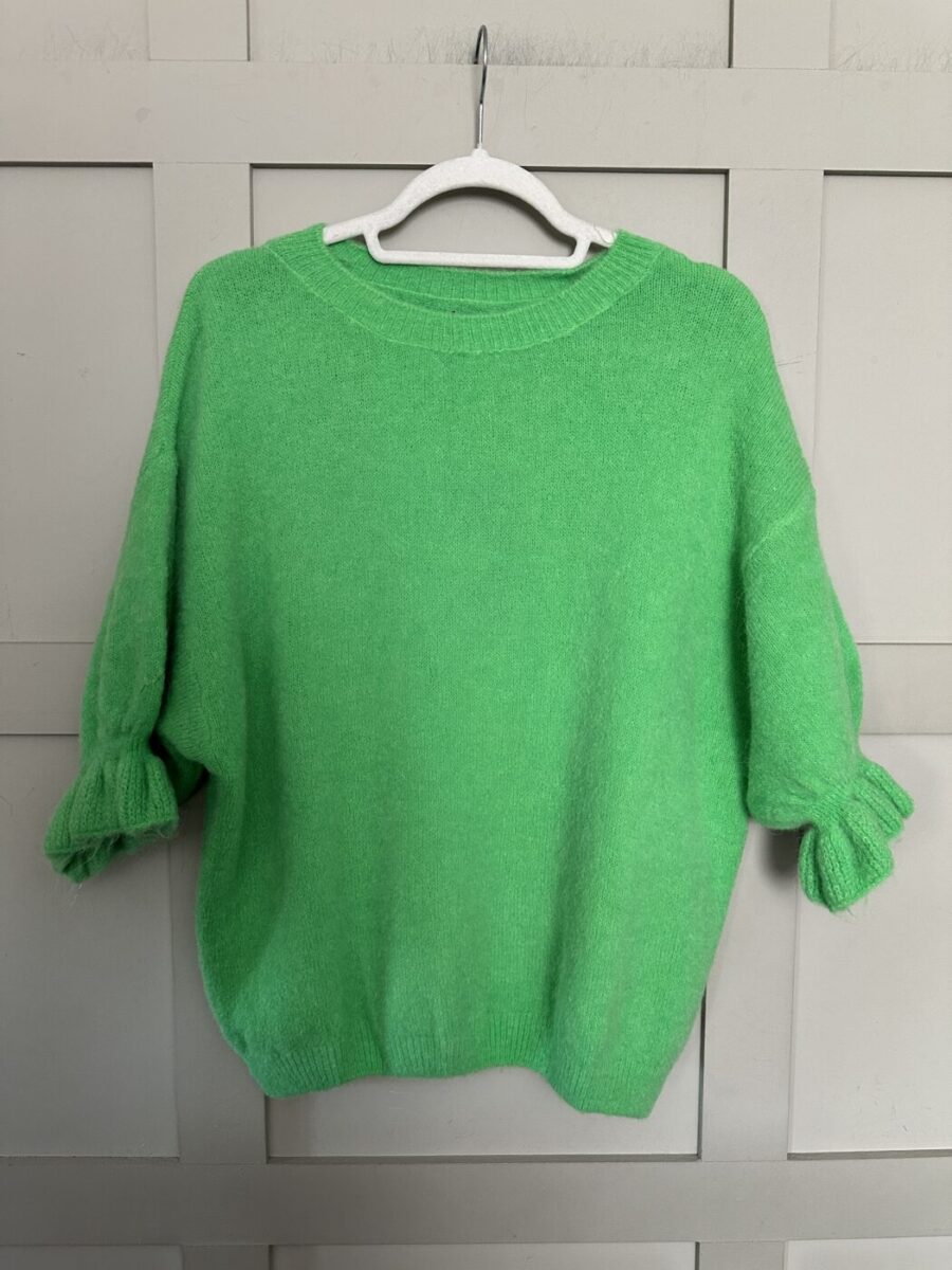 The Eddie jumper is a great way of injecting some colour into your spring/summer wardrobe. It has elbow length sleeves with pretty ruffle cuffs and a crew neckline.