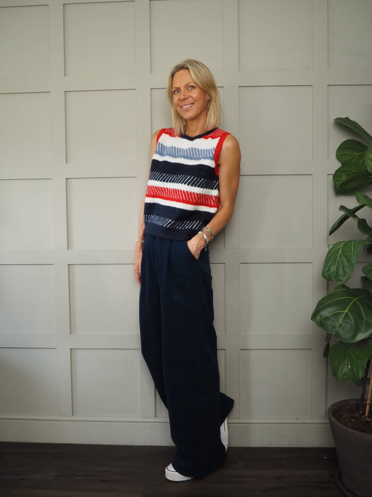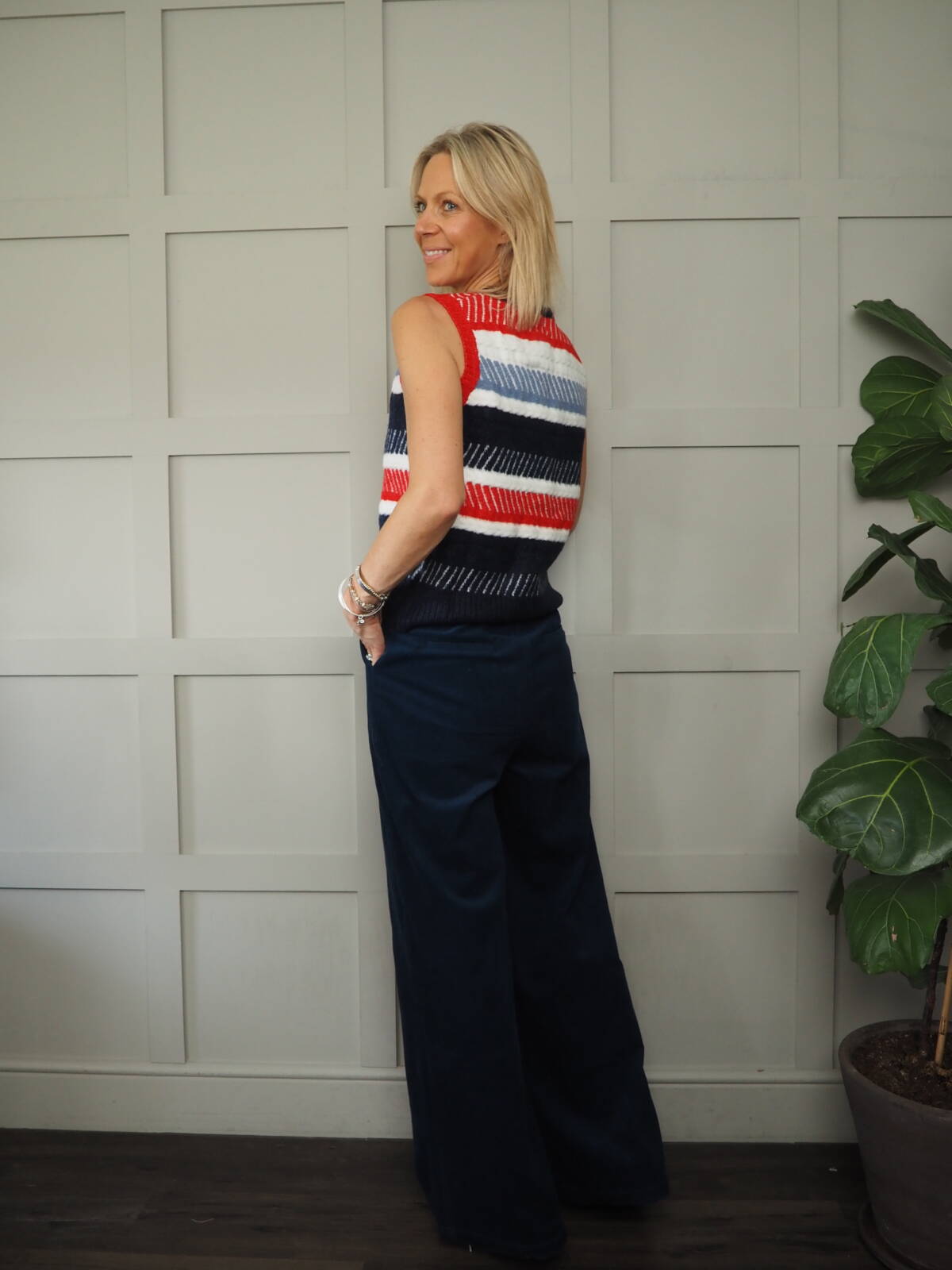 This tank top is called the Line and is super soft and cosy. It has a pattern of Red, Off White, Light and Navy Blue.