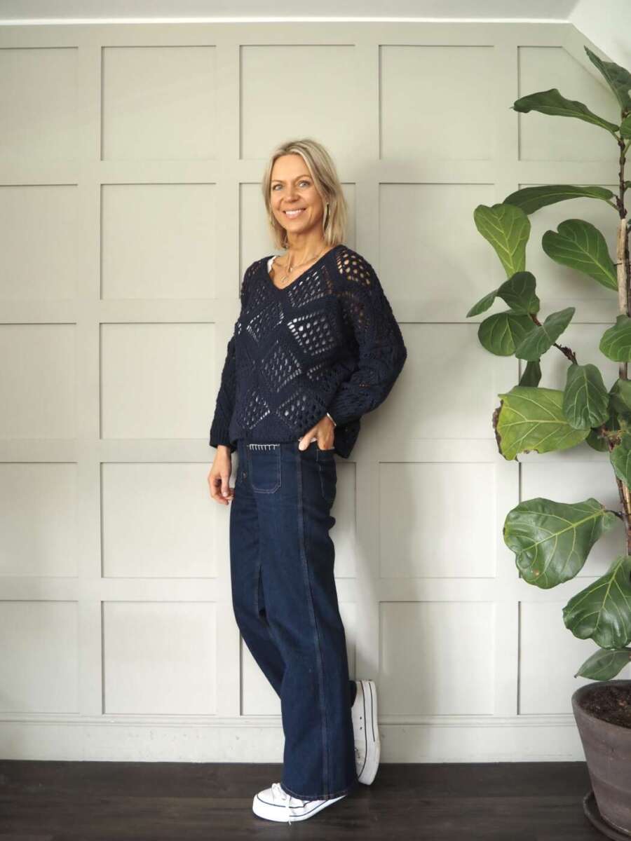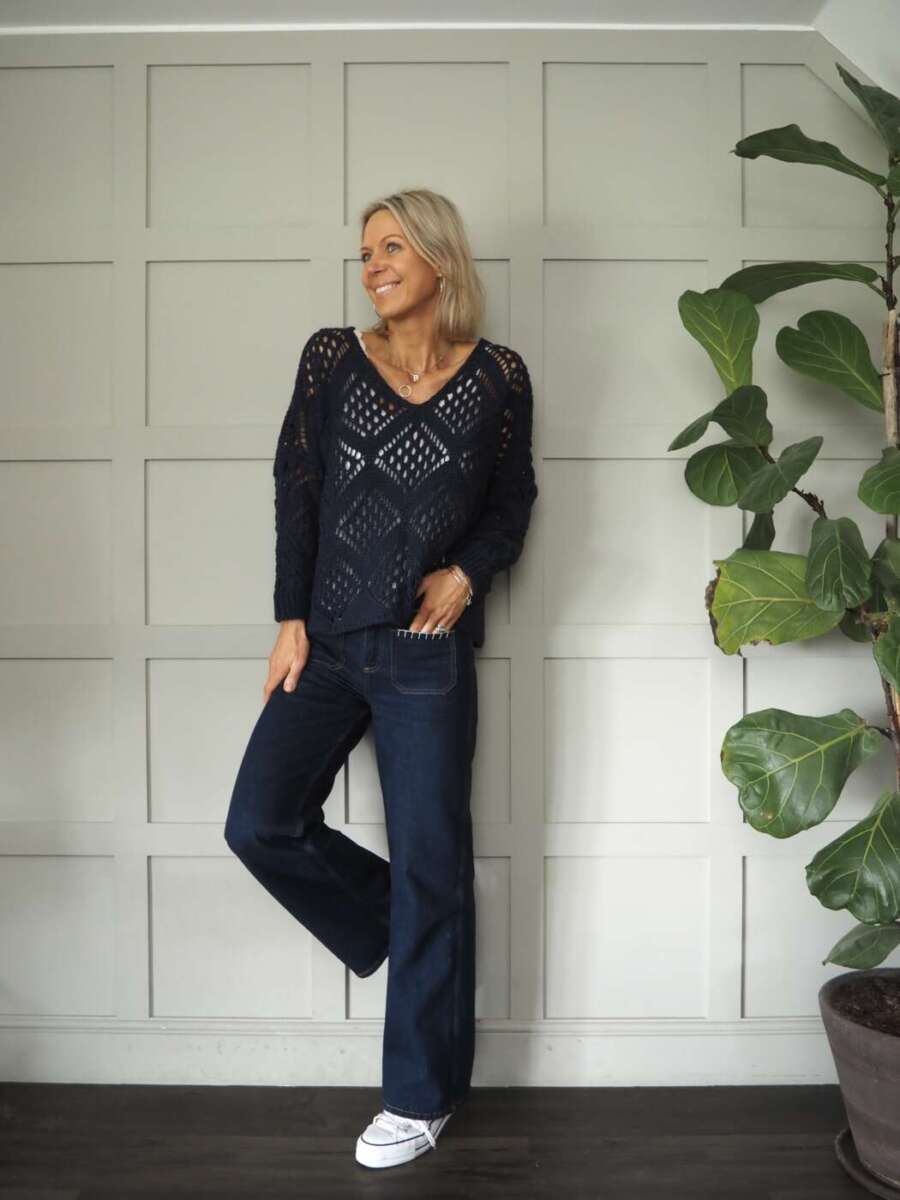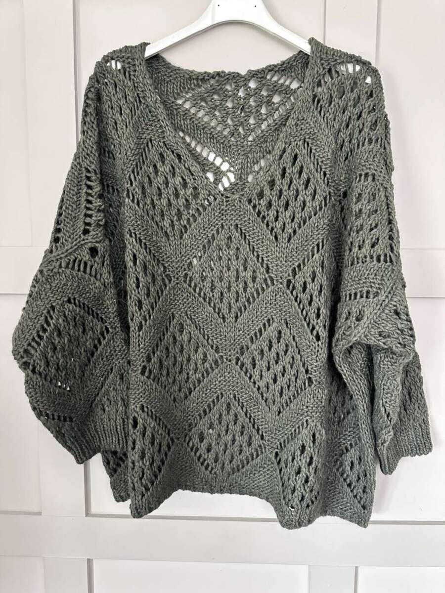 This beautiful diamond knit jumper is a fantastic transitional piece. It looks great with skirts, trousers and jeans.