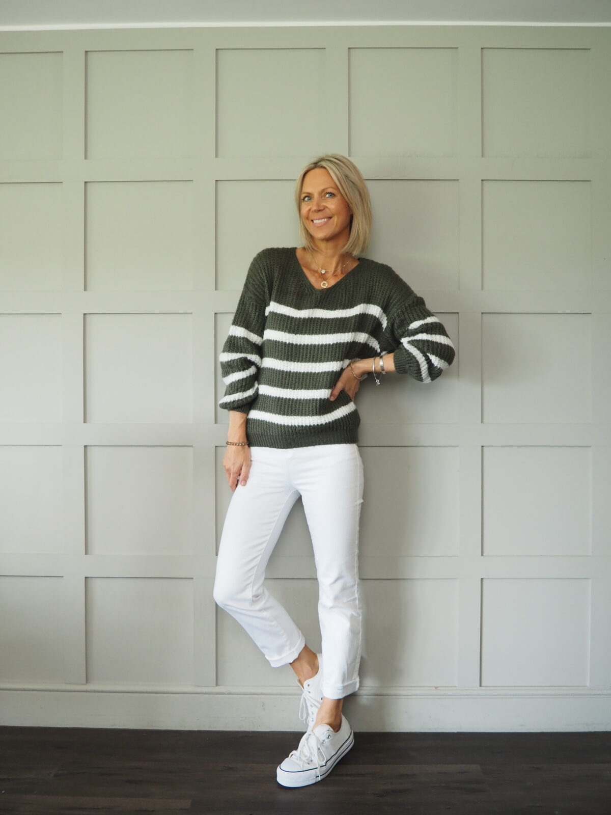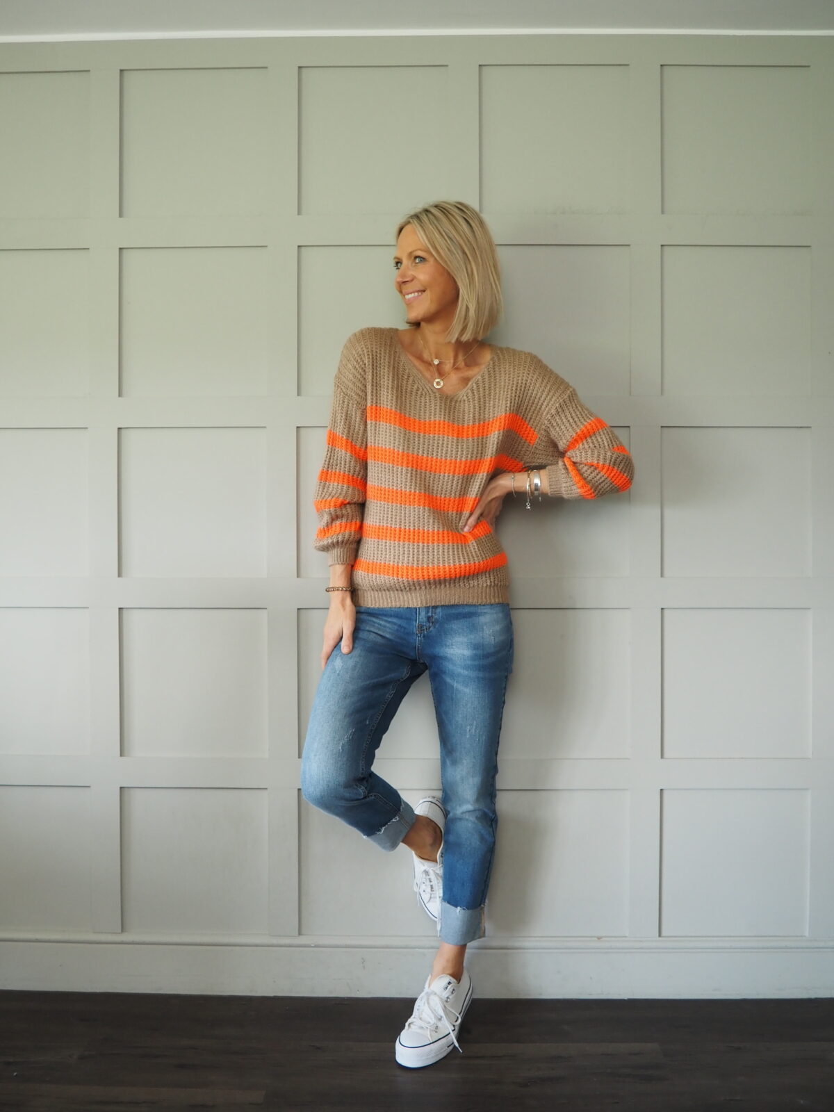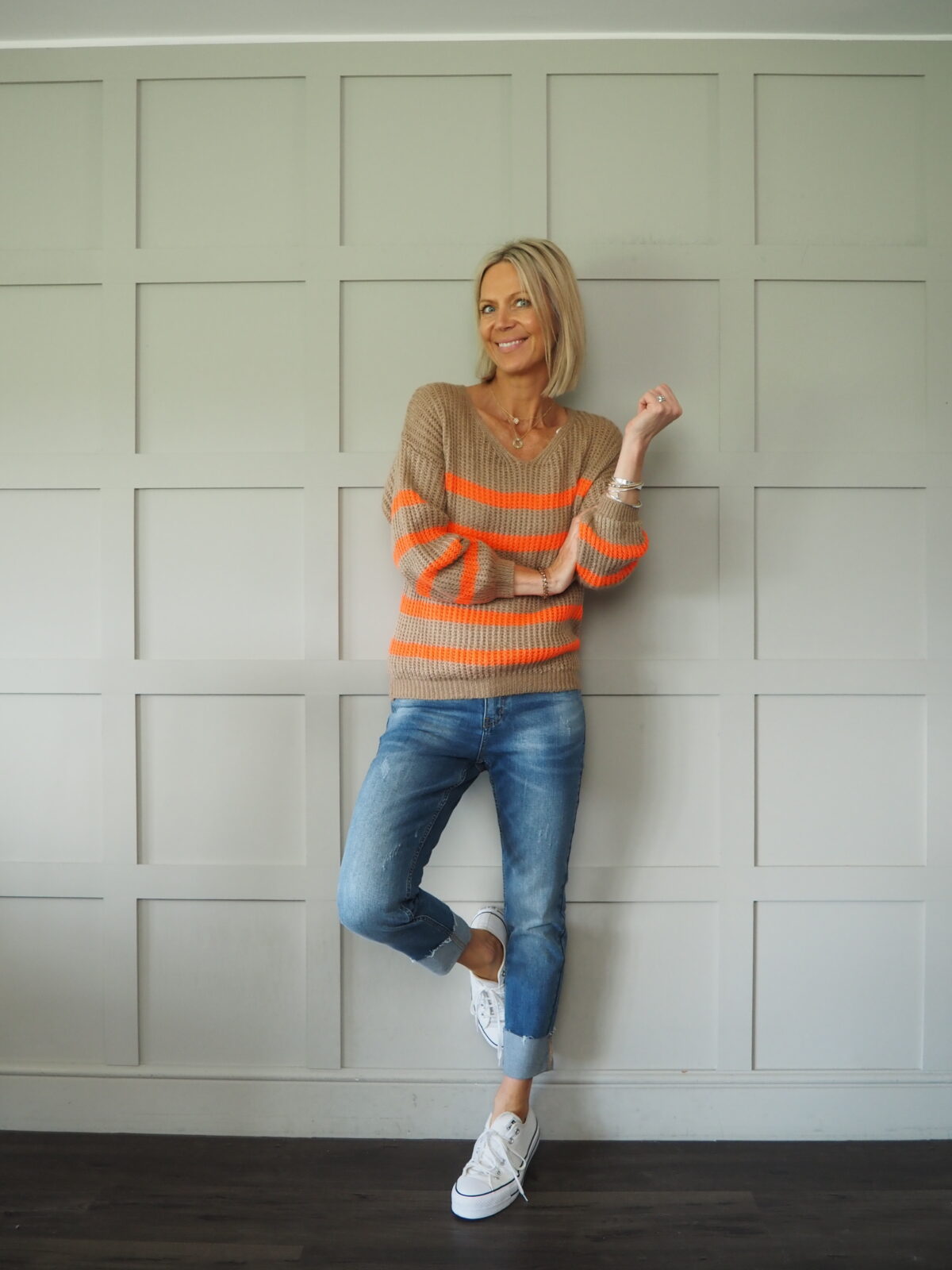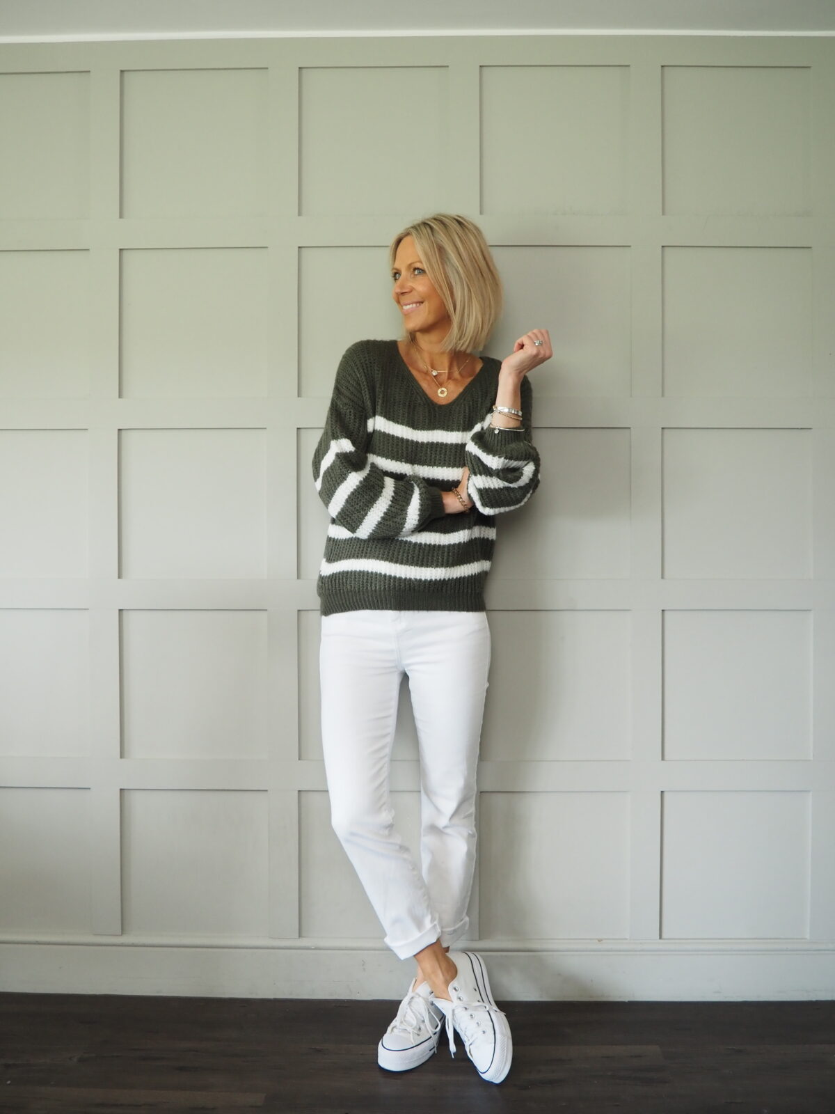This horizontally striped v neck jumper is the perfect knit! So useful and just so fun!