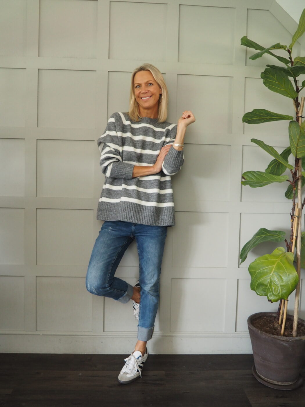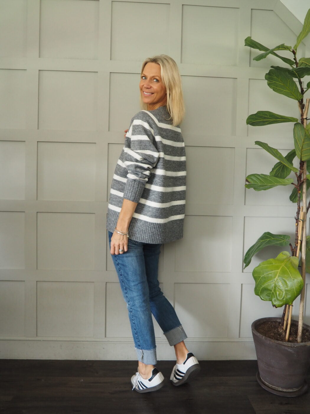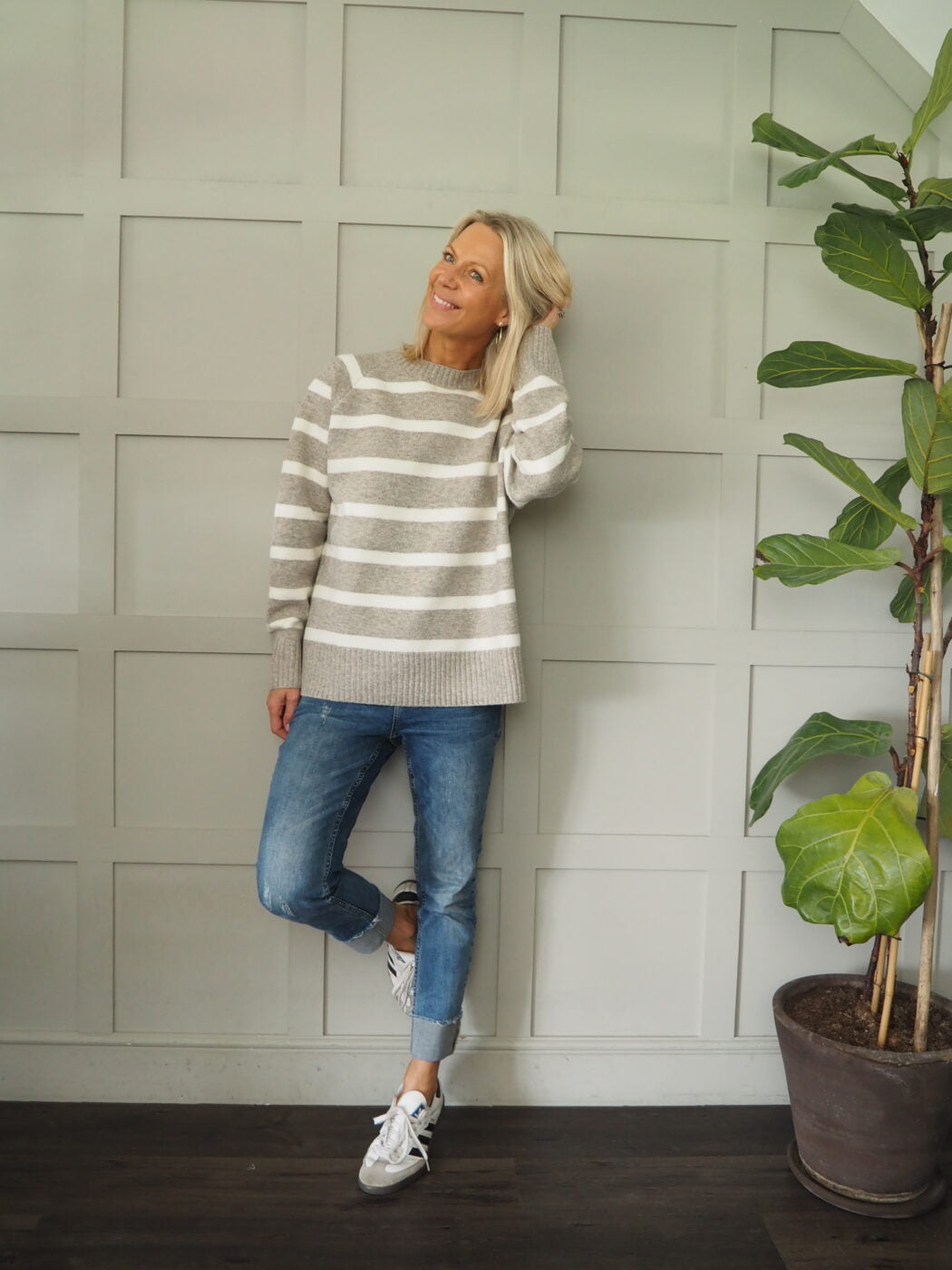 Round necked, striped jumper – this is boxy in style and super stylish and comfortable. The stripes are a Pale Cream.