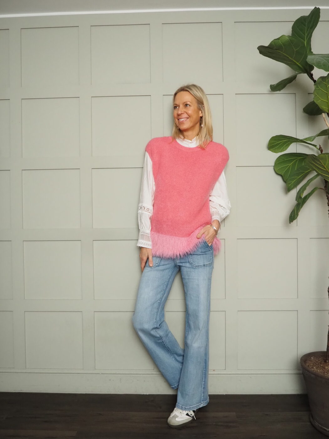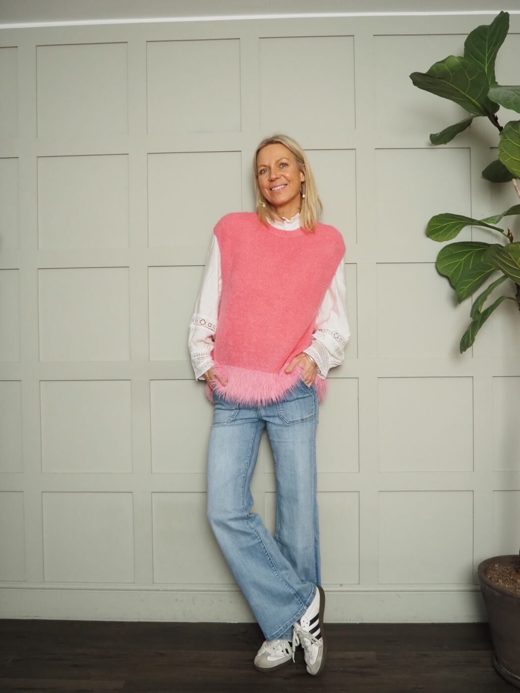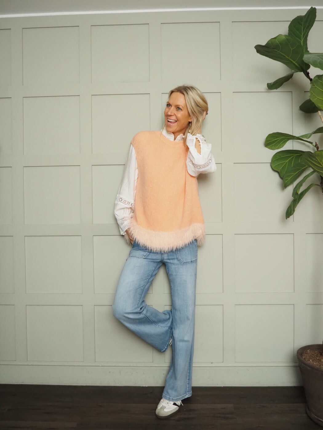 This tank is super soft to the touch and so pretty with its 6” of beautiful fringing detail on the hem. A perfect piece to take you into the spring and to layer over a long sleeve T shirt or blouse.