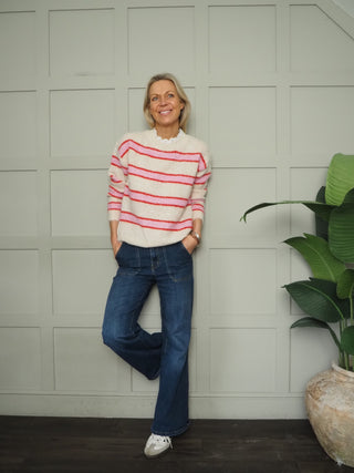 Southwold Stripe Jumper with Broderie Anglaise Detail - Green/Pink, Orange/Pink, Pink/Green, Pink/Red, Sky Blue/Royal Blue, Yellow/Chocolate