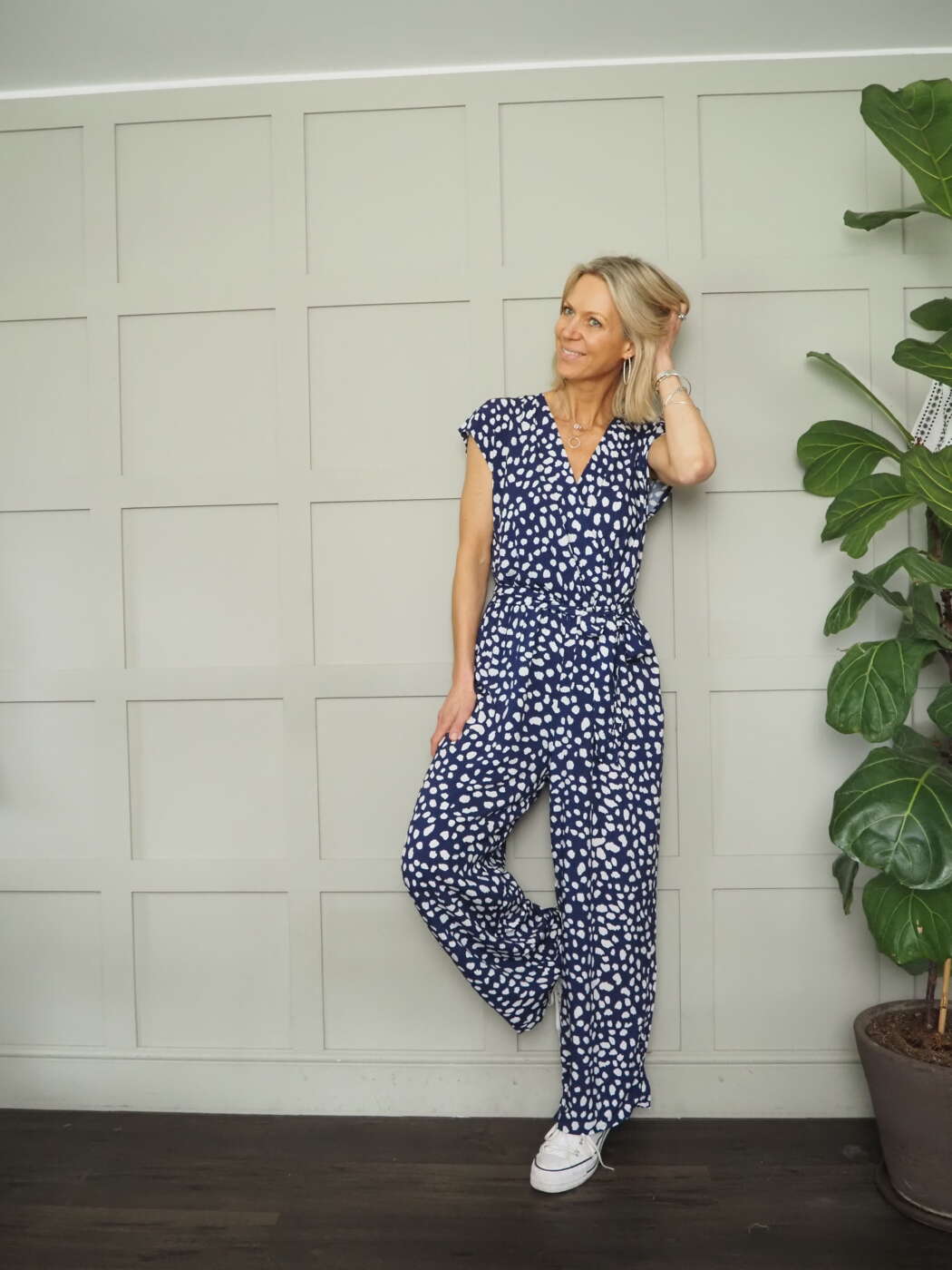 Wrap around jumpsuit which is v-necked, has a detachable belt, wide, floaty legs and capped sleeves. Elasticated waist. Pockets to the side.