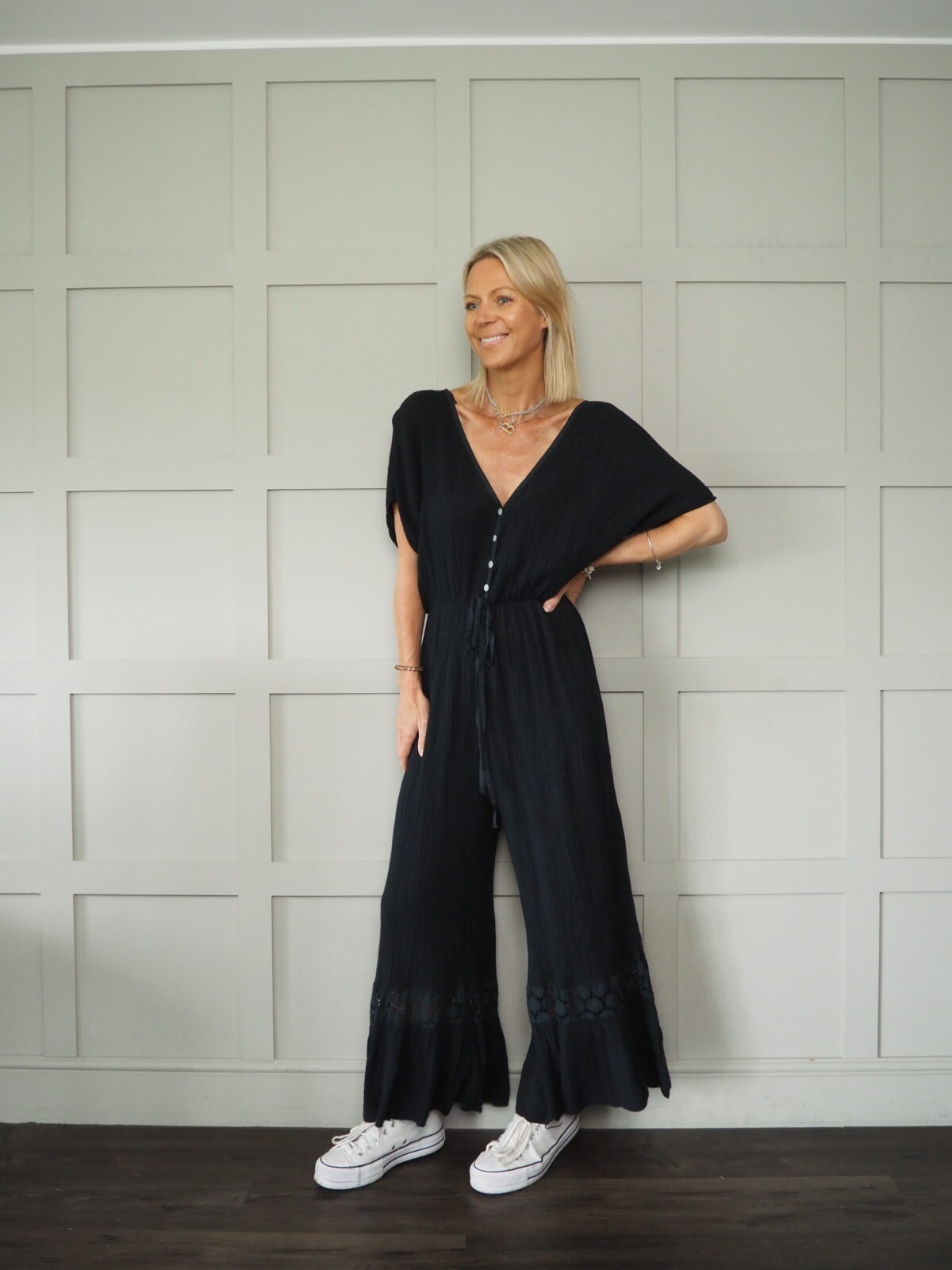 The Kitts cheesecloth jumpsuit is simply perfect for the summer! V neck at the front and back, cap sleeves, drawstring waist and buttons to the front. This jumpsuit has a really pretty pattern at the bottom of each leg.