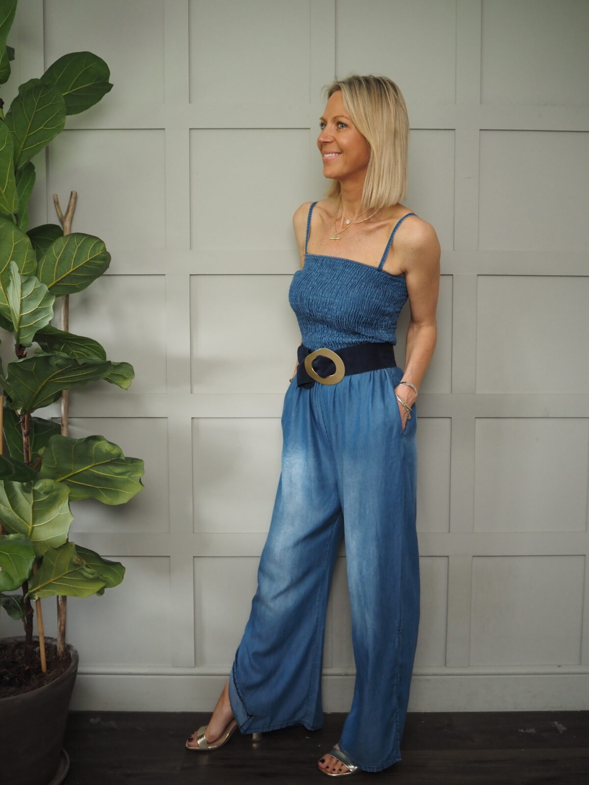 Parki Denim Look Sleeveless Jumpsuit with Shoestring Straps, Ruched Bodice - Denim Blue