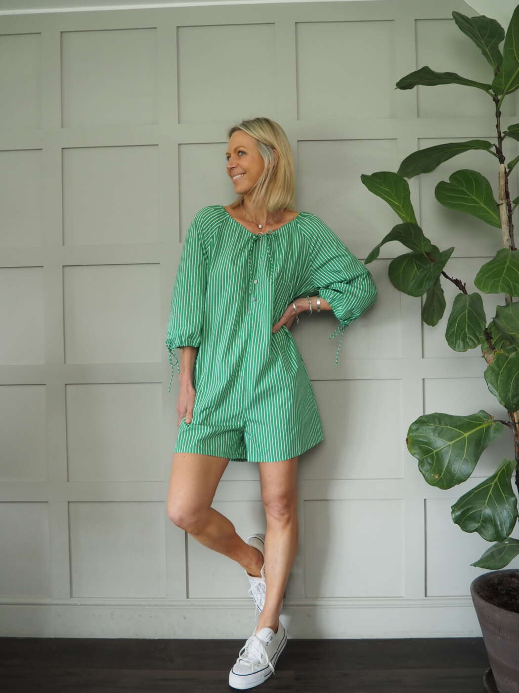 Steffi Short Jumpsuit with Long Sleeves, Elasticated Neckline & Cuffs with Tie Detail by Frnch - Green/White Stripes