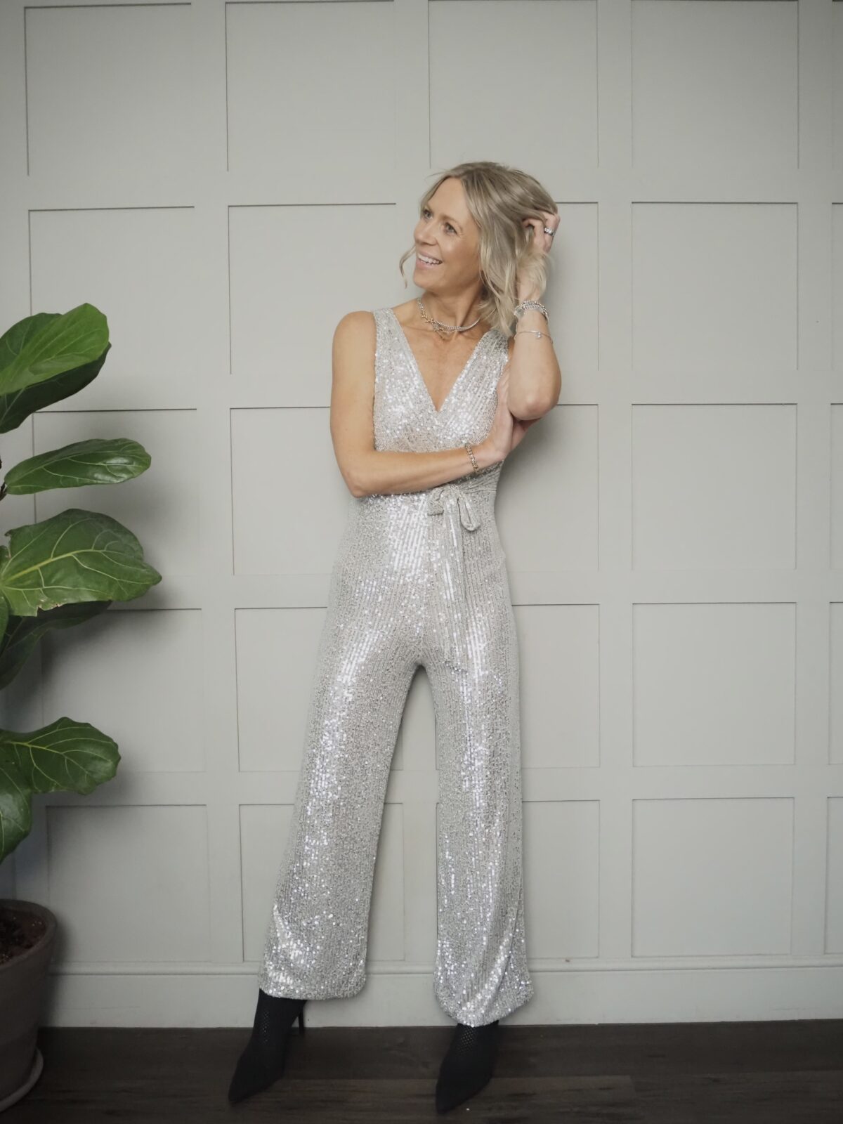 Tess Sleeveless Sequin Jumpsuit with V Shaped ‘Wrap’ Neckline & Waist Tie & Straight Leg - Silver