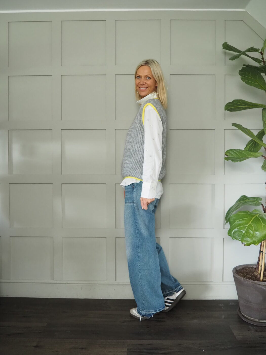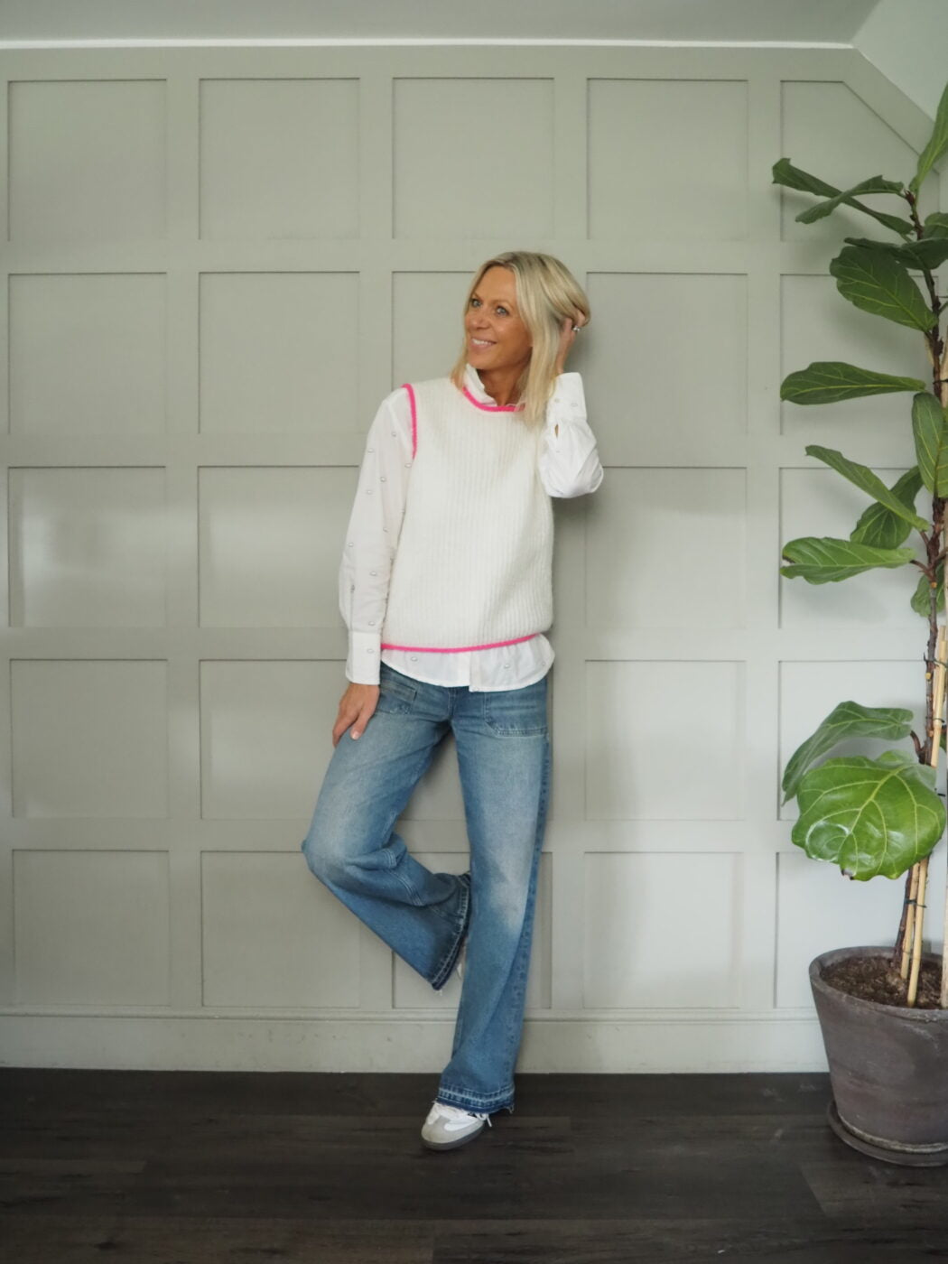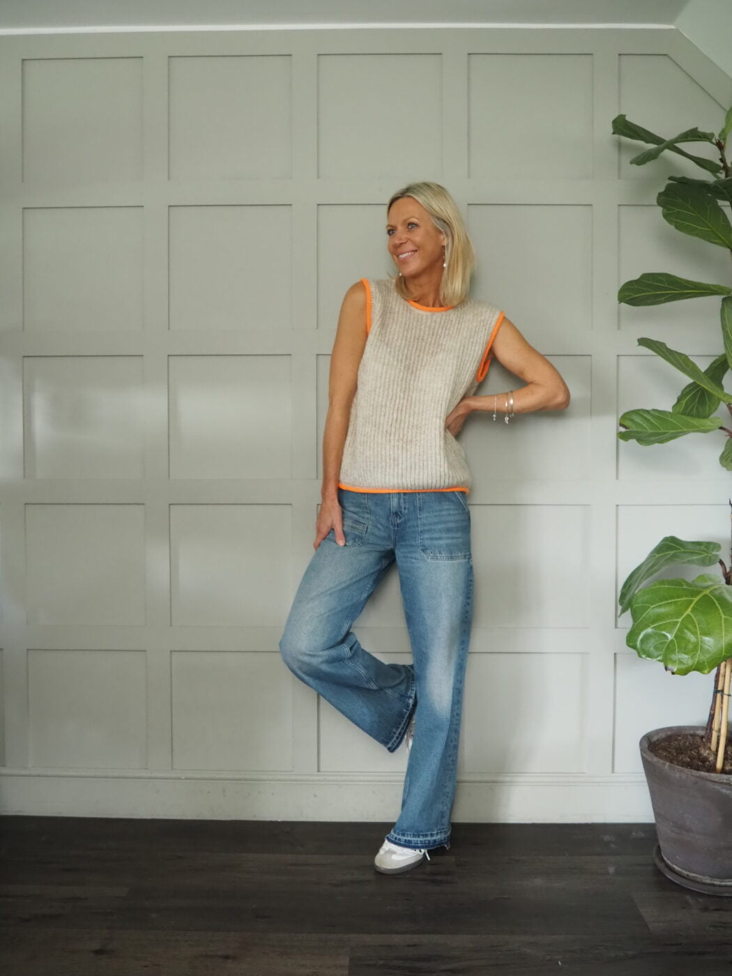 This tank is cute and fun with a contrasting neon stripe/piping on the neck, shoulders and hem. It comes in oatmeal with neon orange piping, ecru with neon pink piping and grey with neon yellow piping – worn here with GIANNA Cloud Shirt and the ELODIE FULL LENGTH Jeans – Pasadena Vintage