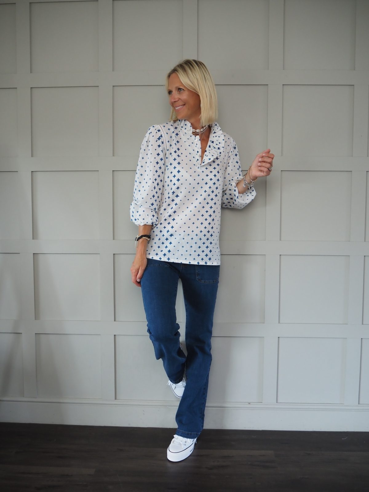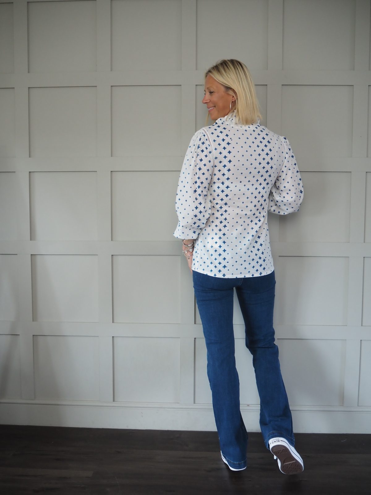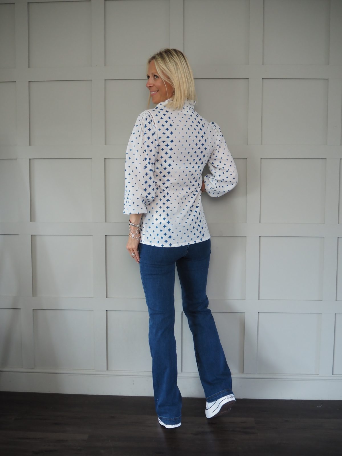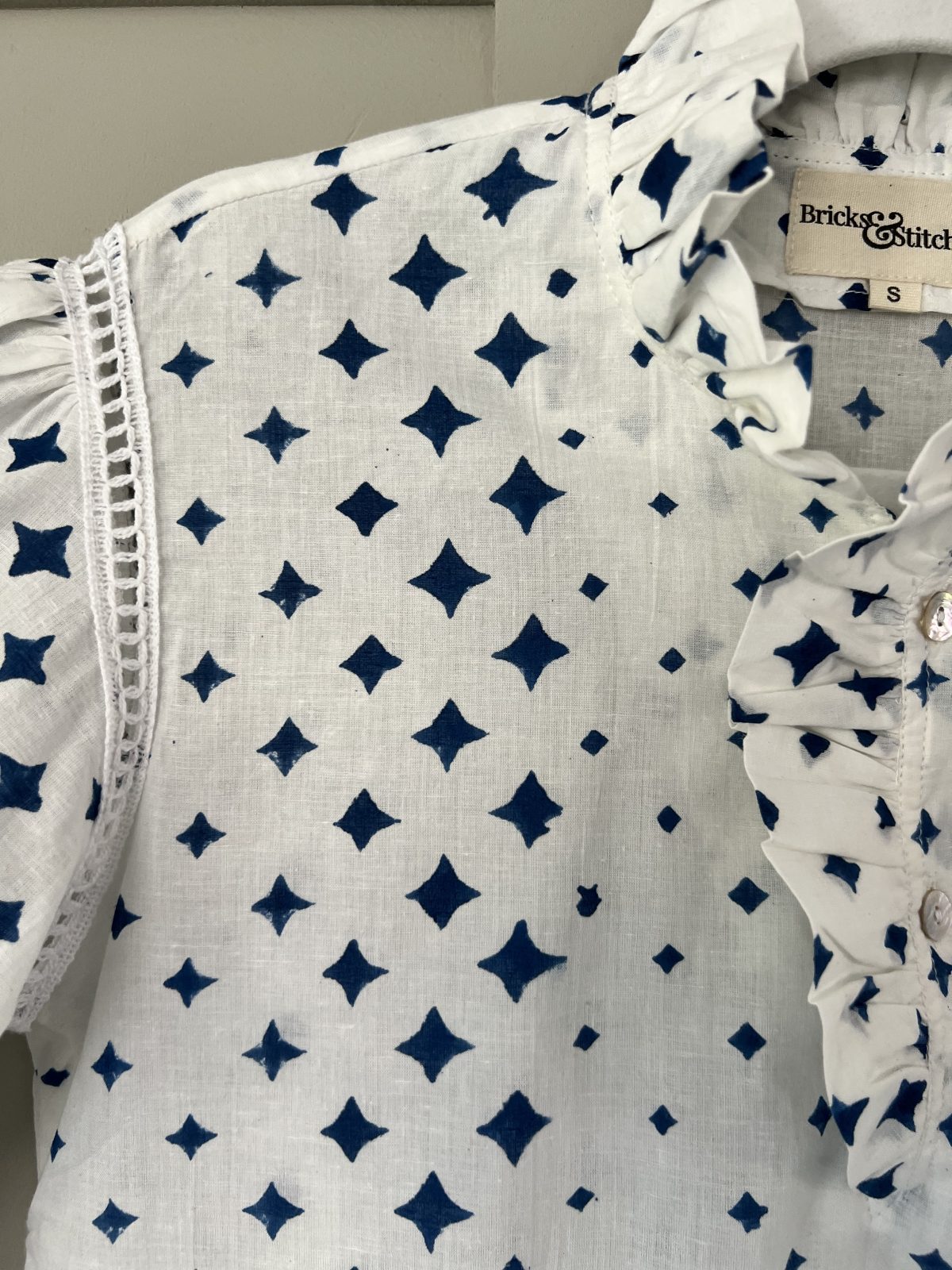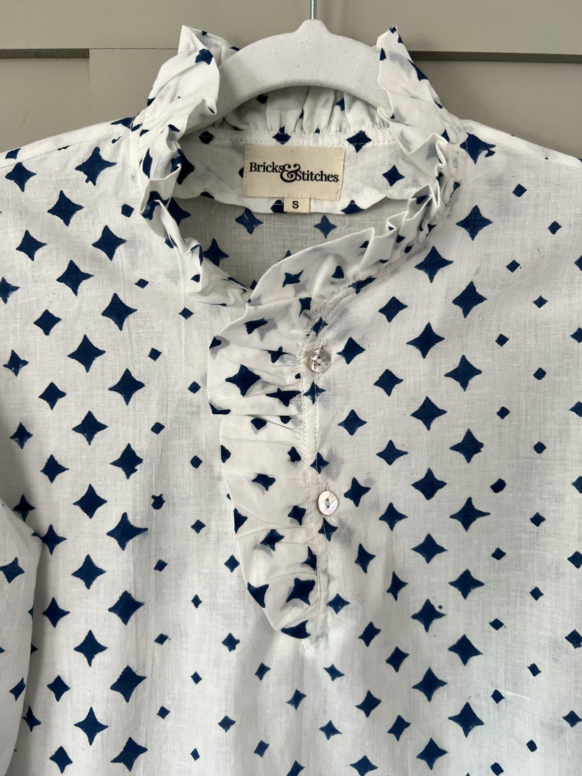 This beautiful scatter Blue diamond print blouse has been designed exclusively for Bricks and Stitches. It has been traditionally printed on cotton using a hand carved wooden block print. This fitted blouse has beautiful stitching detail on the shoulders, three buttons down the front and a high ruffle collar. The sleeves are slightly cropped with elasticated cuffs.