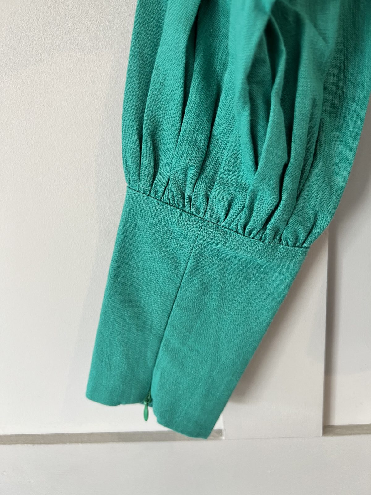 Beautiful linen/cotton mix fitted blouse with frilly detailing, covered buttons and zipped cuffs.