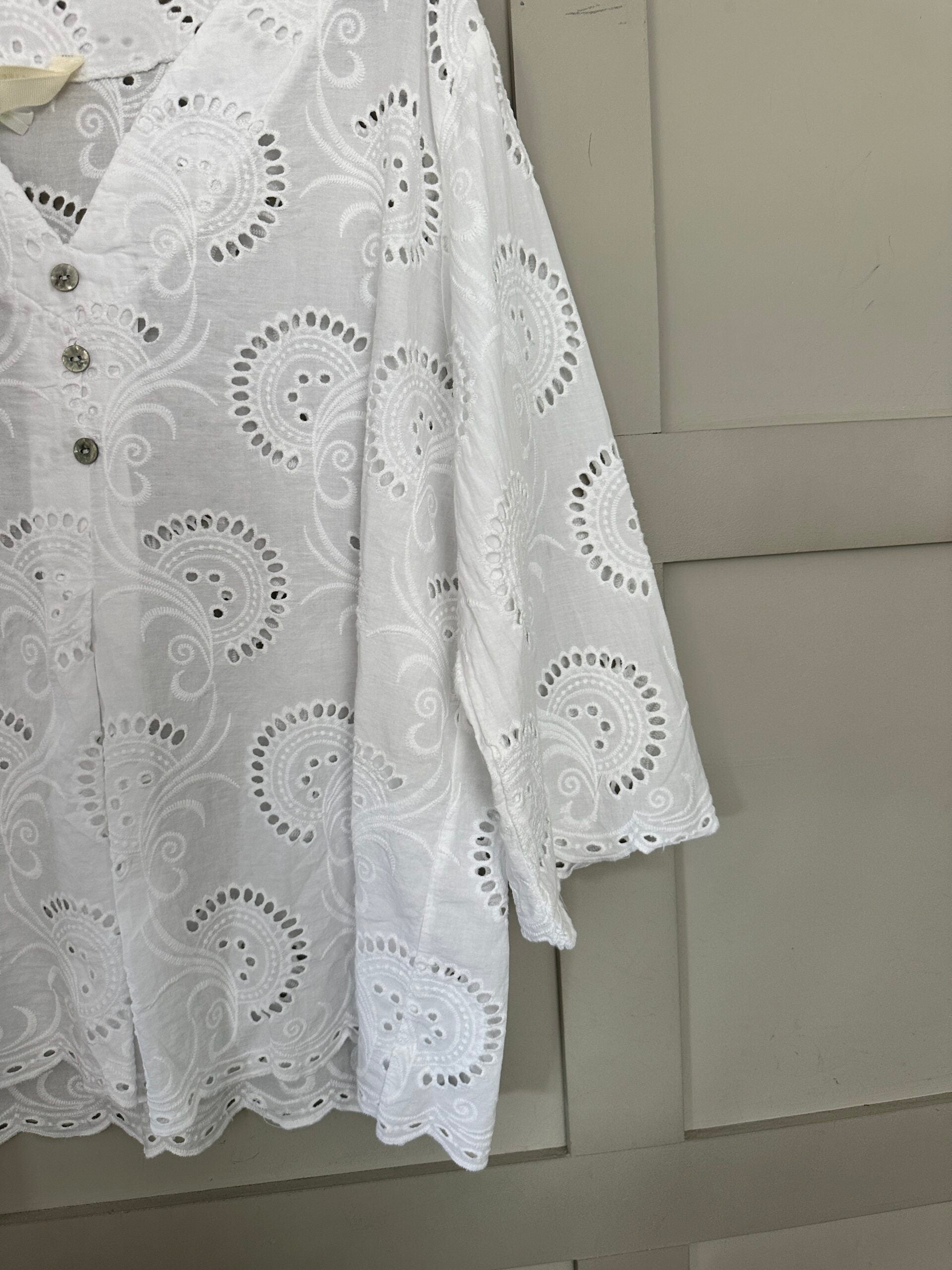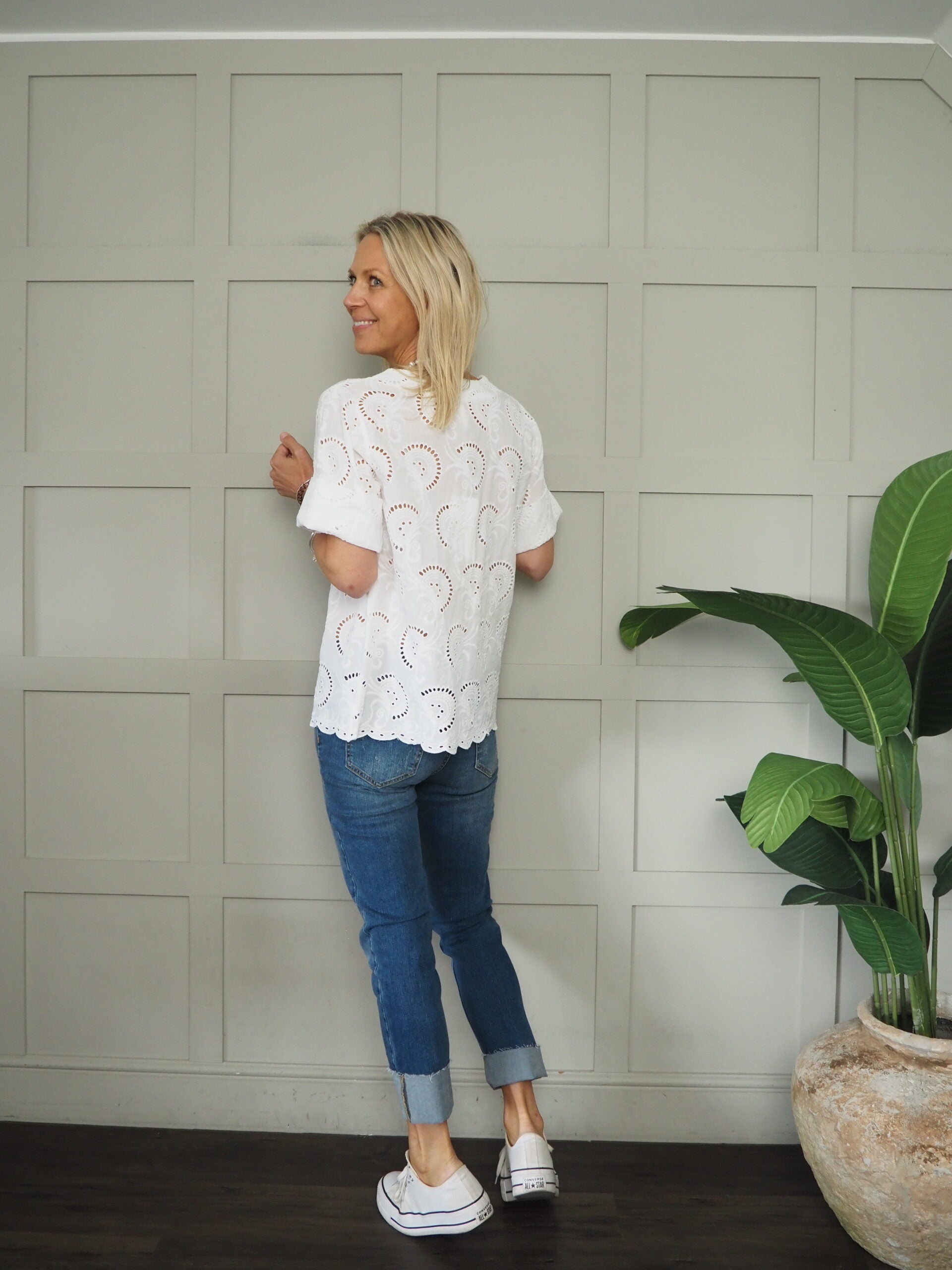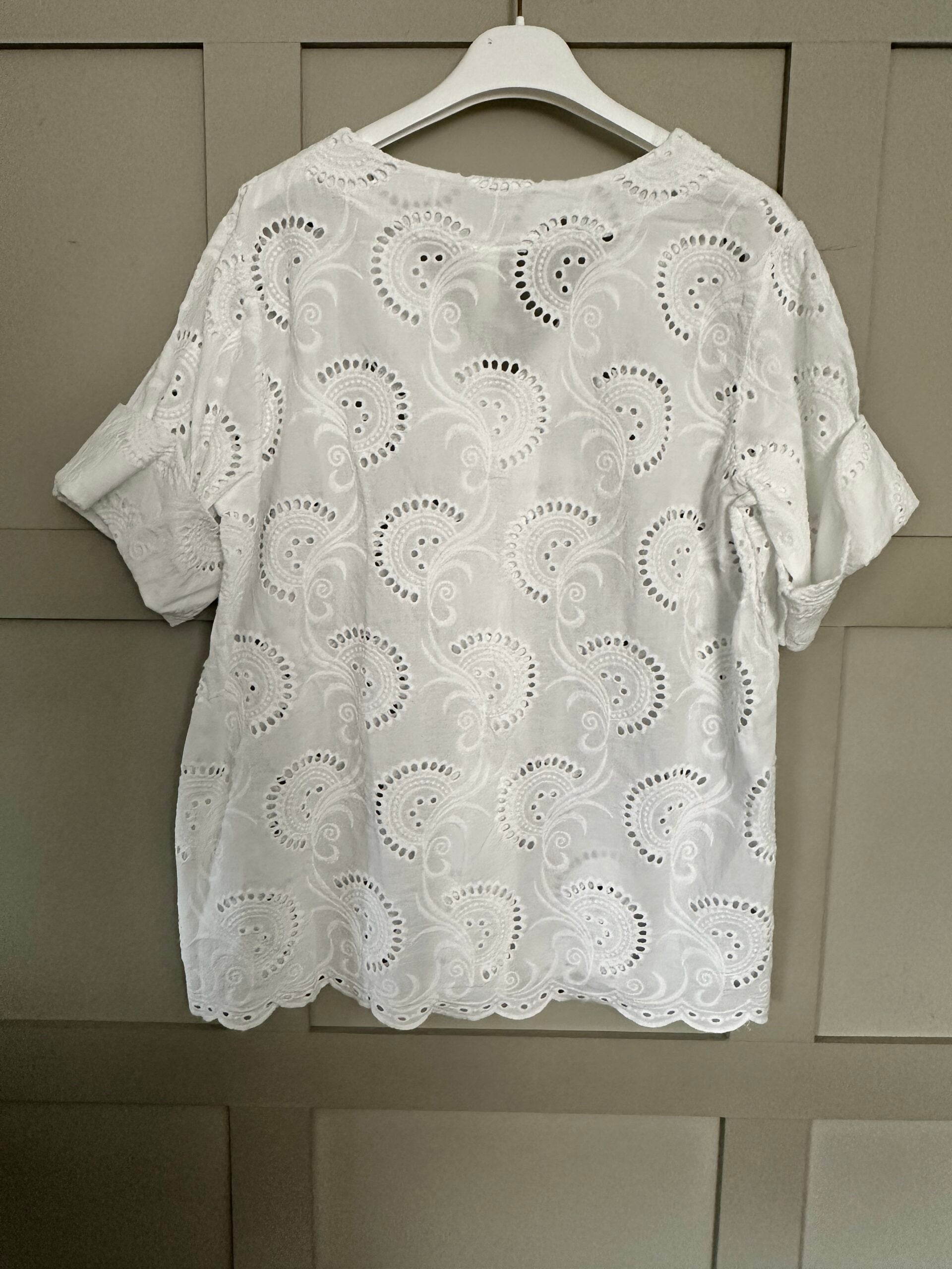 This beautiful broderie Anglaise blouse has cropped sleeves with a scalloped cuffs which can be folded up. It has a v neckline with three mother of pearl buttons, an inverted pleat and a scalloped hem. A very classic piece which is a beautiful wardrobe addition. Perfect worn with shorts, jeans or trousers.