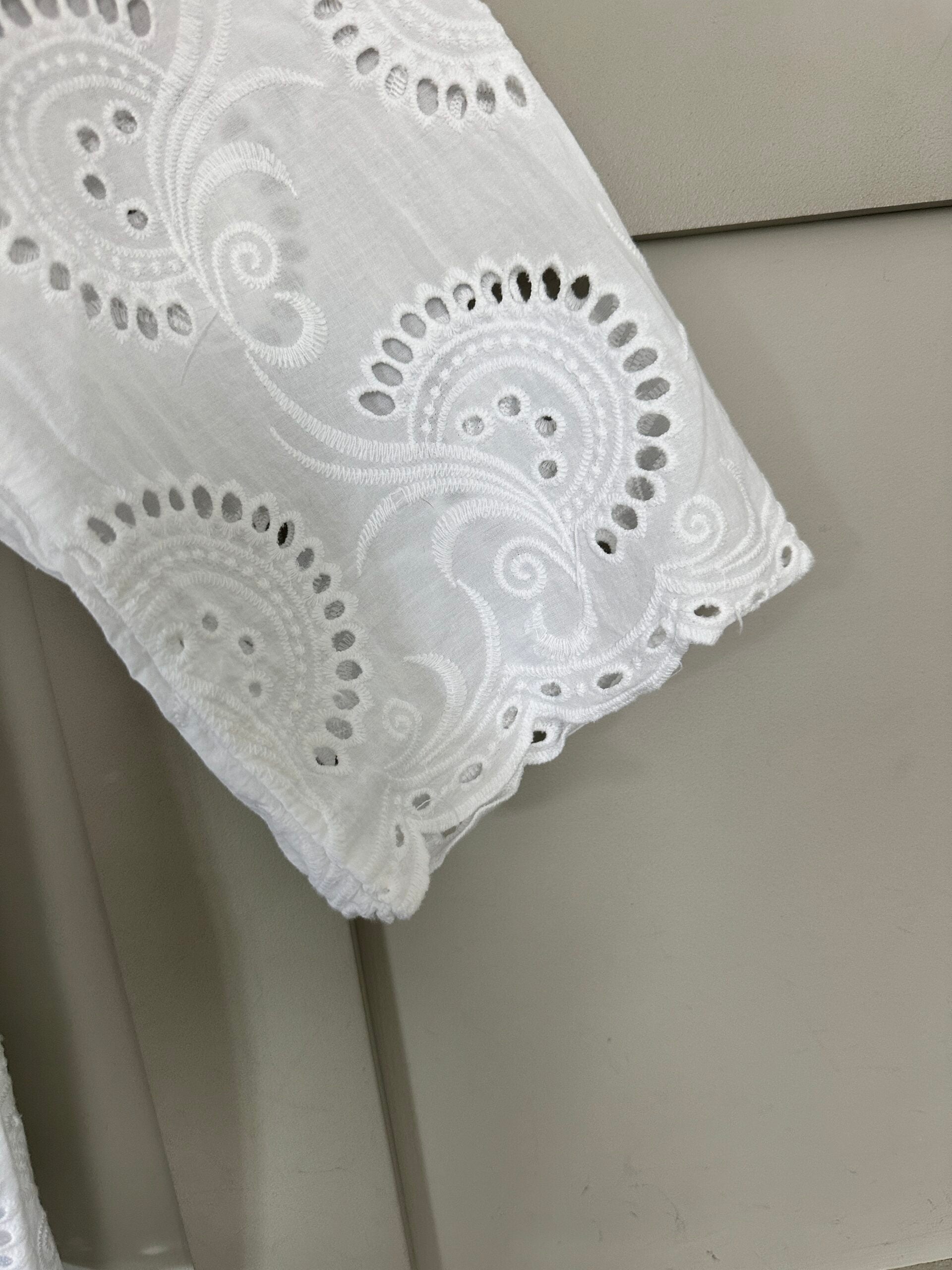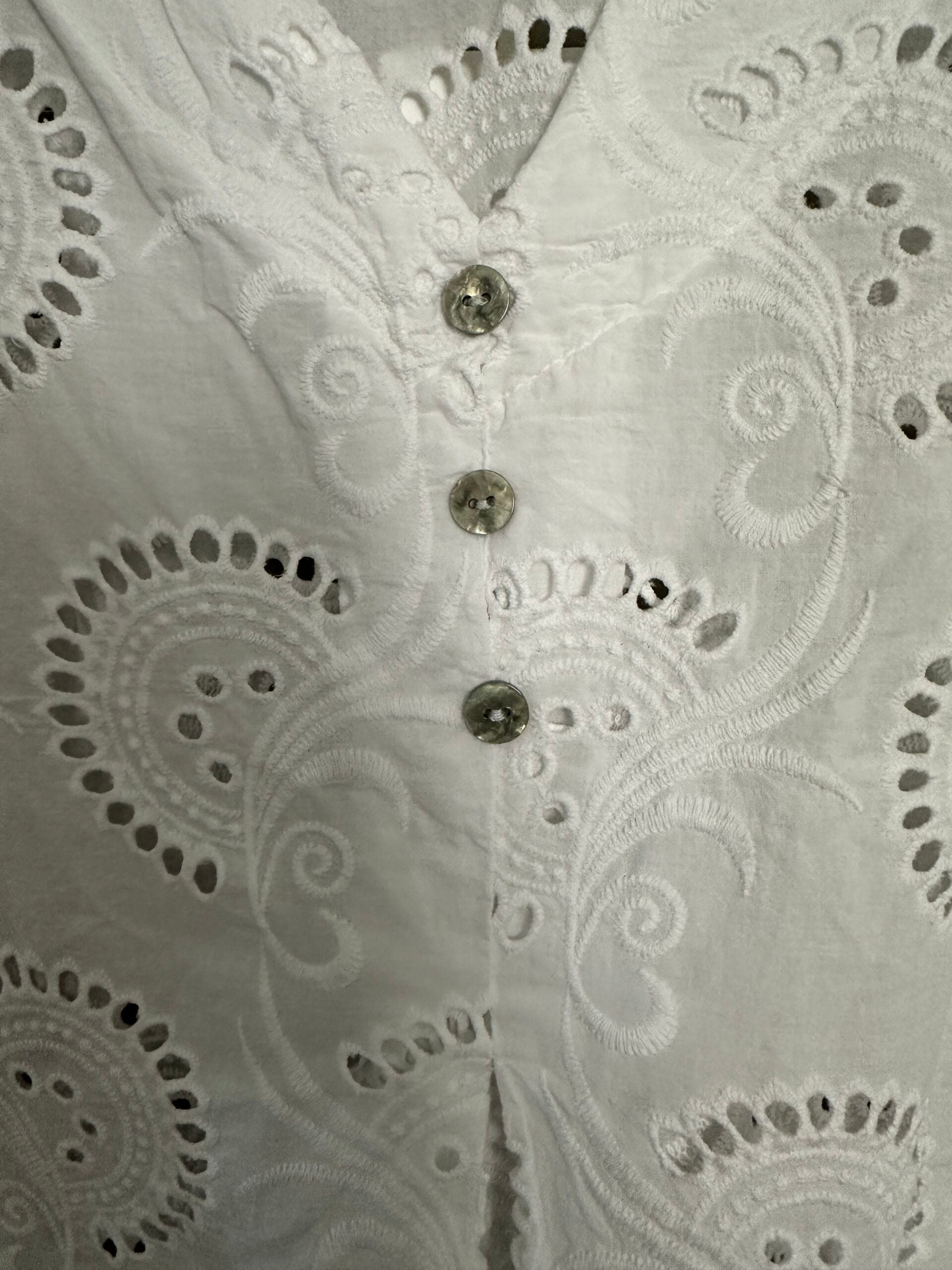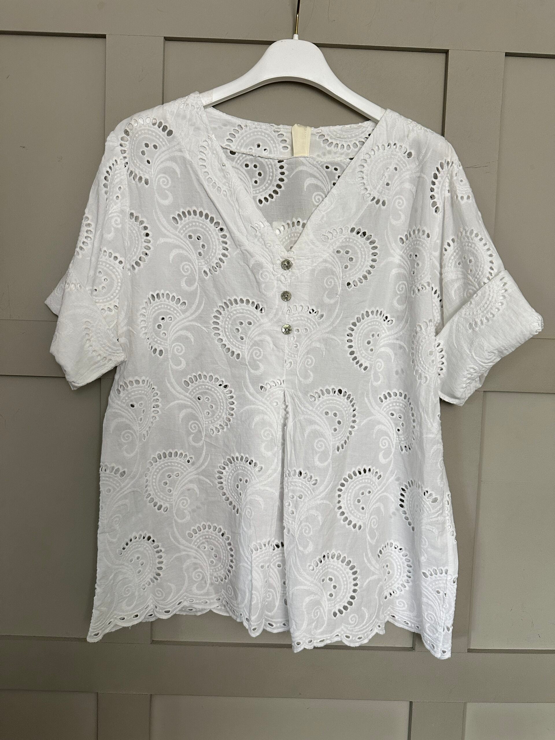 This beautiful broderie Anglaise blouse has cropped sleeves with a scalloped cuffs which can be folded up. It has a v neckline with three mother of pearl buttons, an inverted pleat and a scalloped hem. A very classic piece which is a beautiful wardrobe addition. Perfect worn with shorts, jeans or trousers.
