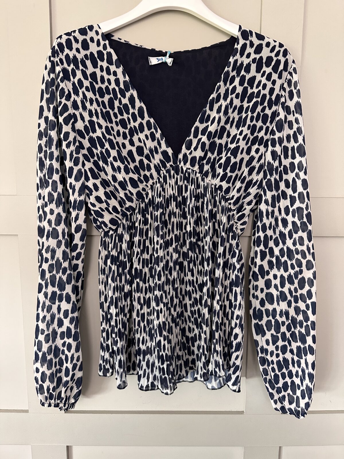 This blouse is very pretty with a sheer top half. It is lined to below the bust. Featuring a deep V Neck and cute pleating detail from the bust downwards, long sleeves with elasticated cuffs. Elasticated under the bust.