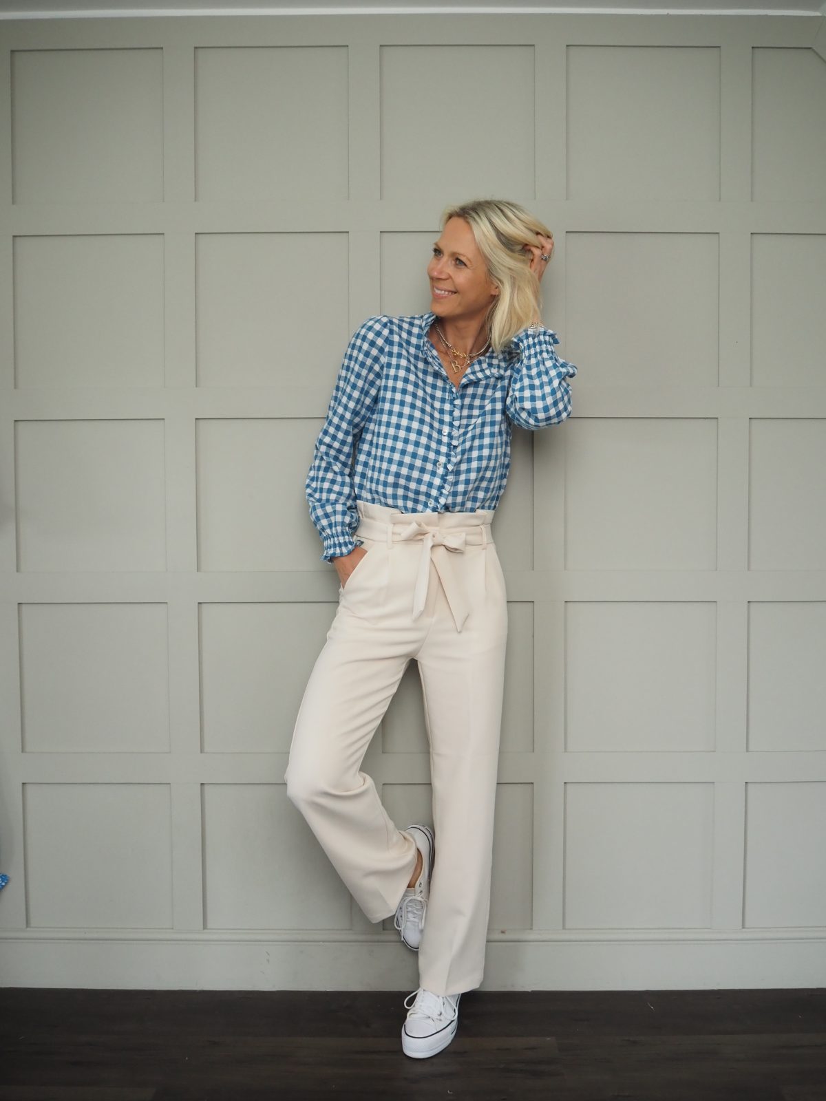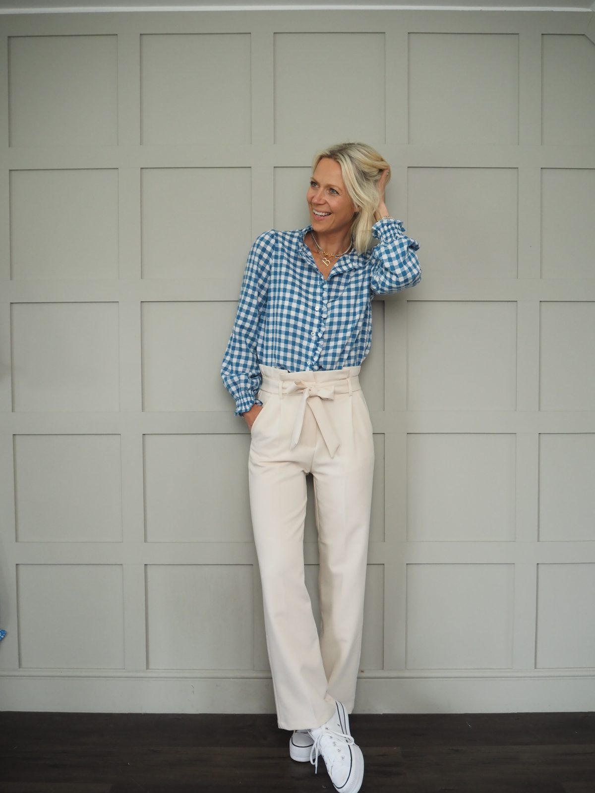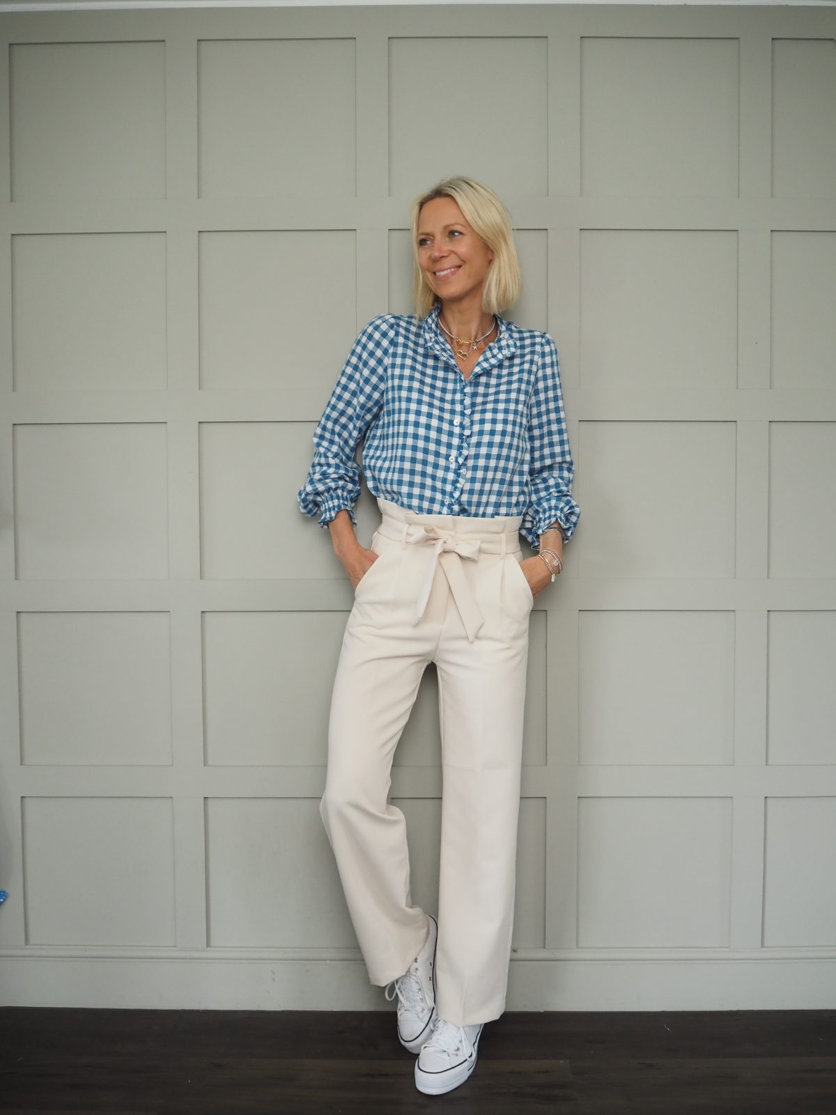 This boxy checked blouse is a beautiful addition to your wardrobe. Can be worn casually with jeans or dressed up with trousers or a skirt. Elasticated ruffle cuffs, button front with ruffle detailing down the front and high collar.