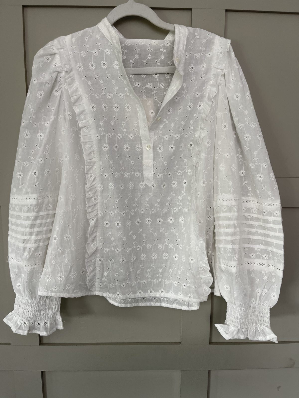 Beautiful broderie anglaise pull over blouse with ruffles down the front and pin tuck detailing on the sleeves. Elasticated cuffs.