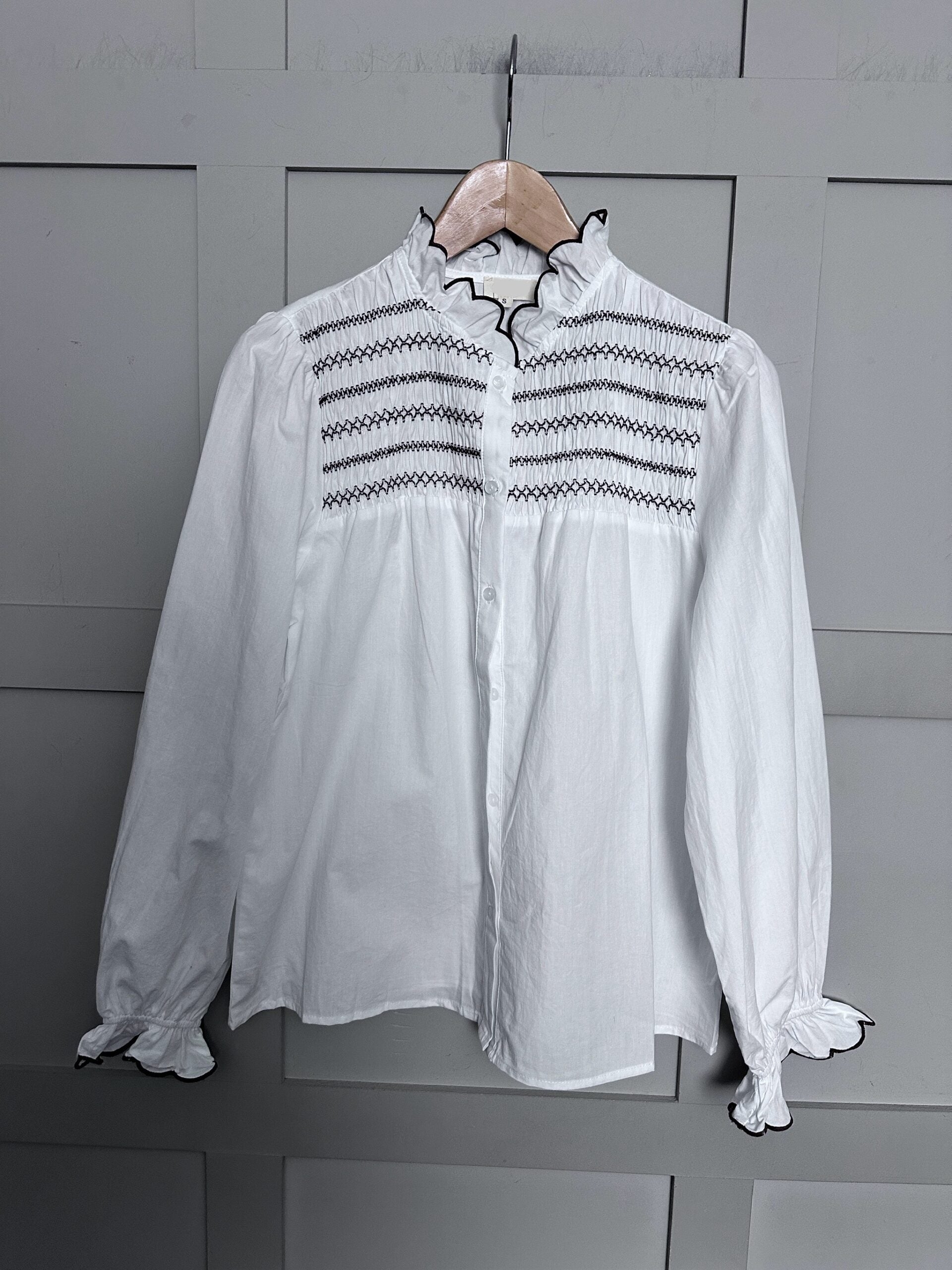 This beautiful cotton blouse has such fabulous details, it is smocked on the chest and has lovely scalloped cuffs which are elasticated and a scalloped collar with coloured edging. A perfect piece to pair casually with jeans, layer with a knit or jacket or dress up with a skirt or tailored trousers.