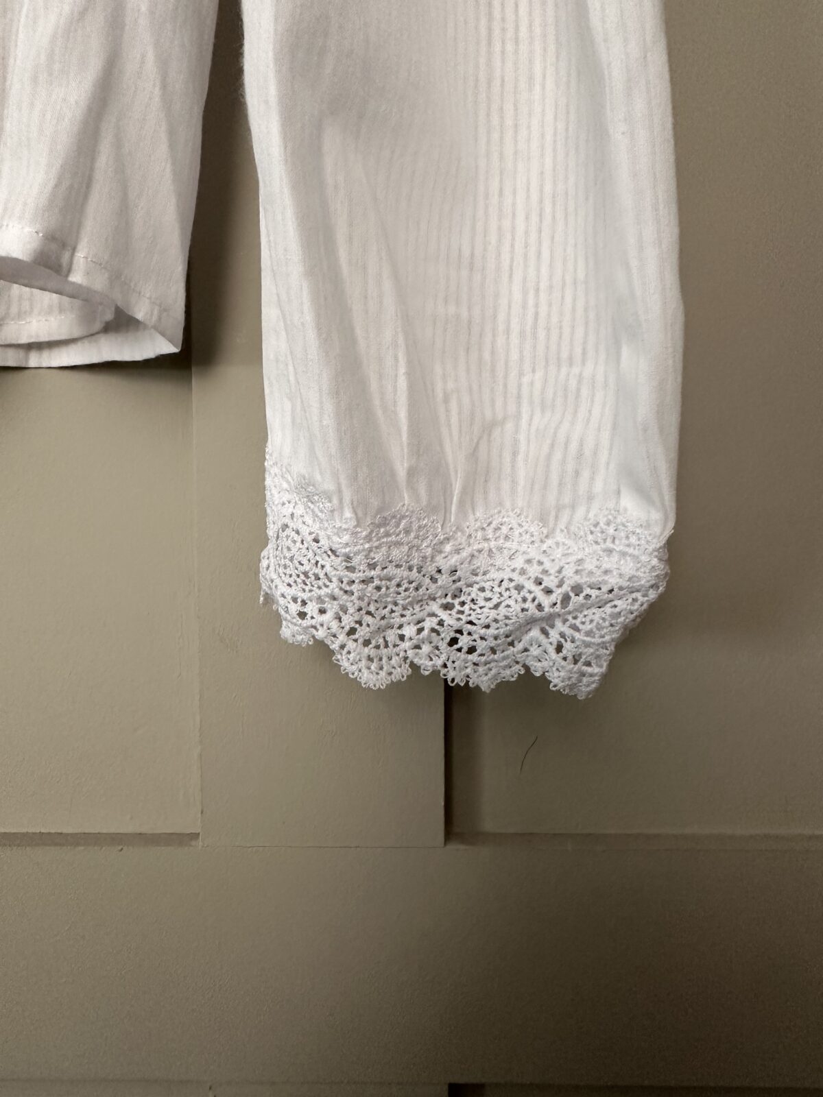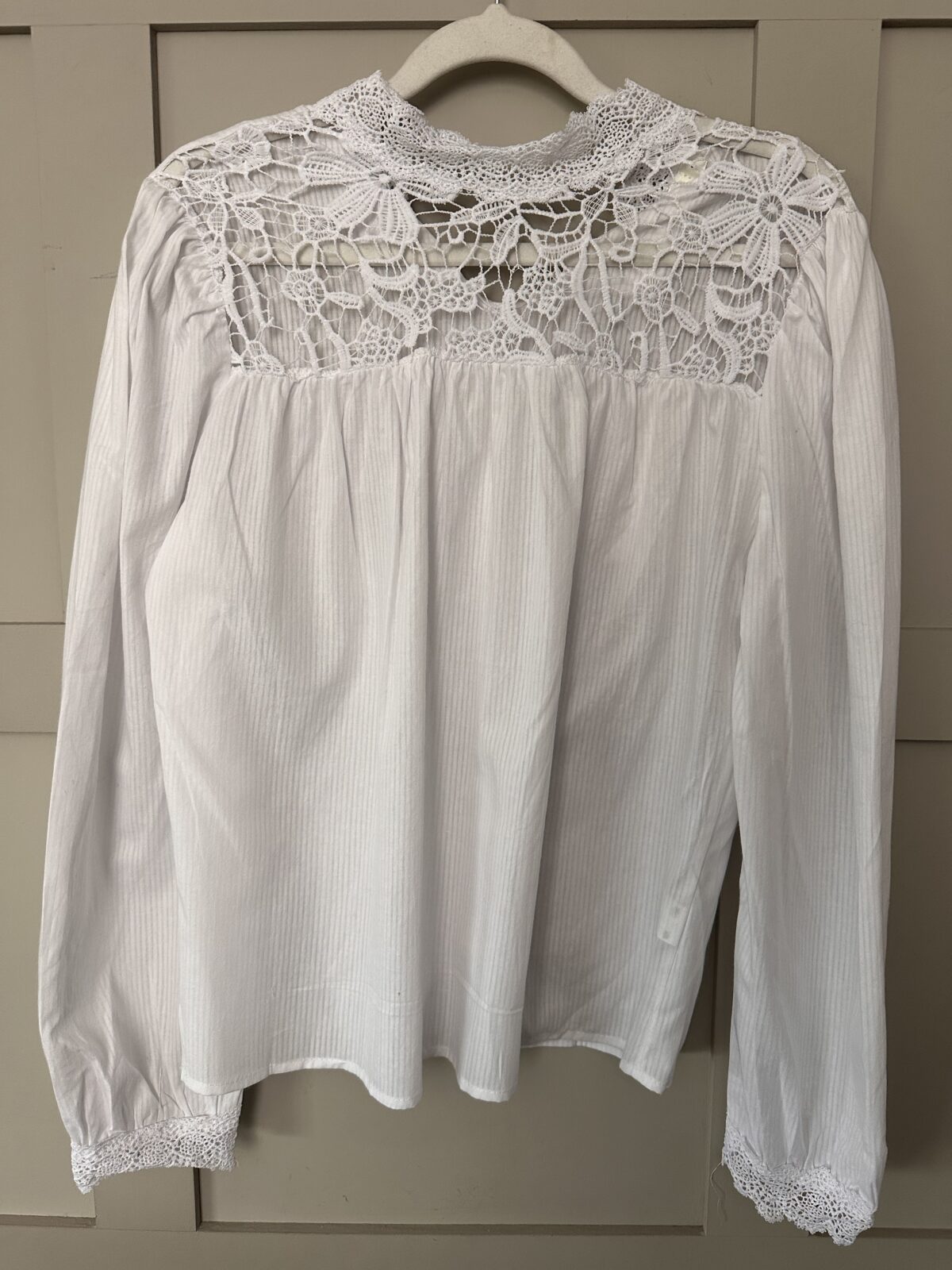 High necked blouse in 100% cotton to keep you cool. Super pretty lacy detailing on the front and cuffs. Single button fastening to the back of the neck.