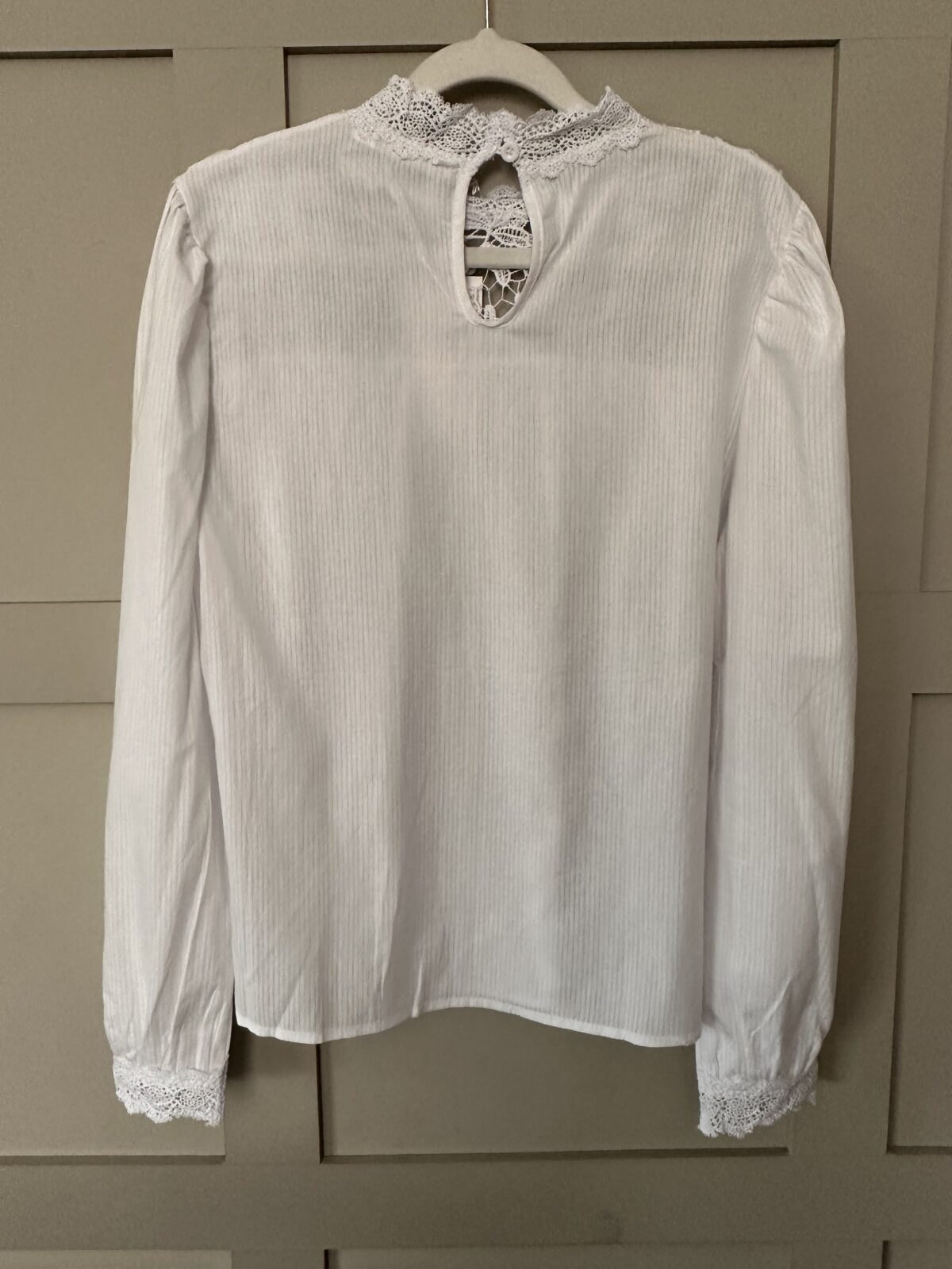 High necked blouse in 100% cotton to keep you cool. Super pretty lacy detailing on the front and cuffs. Single button fastening to the back of the neck.