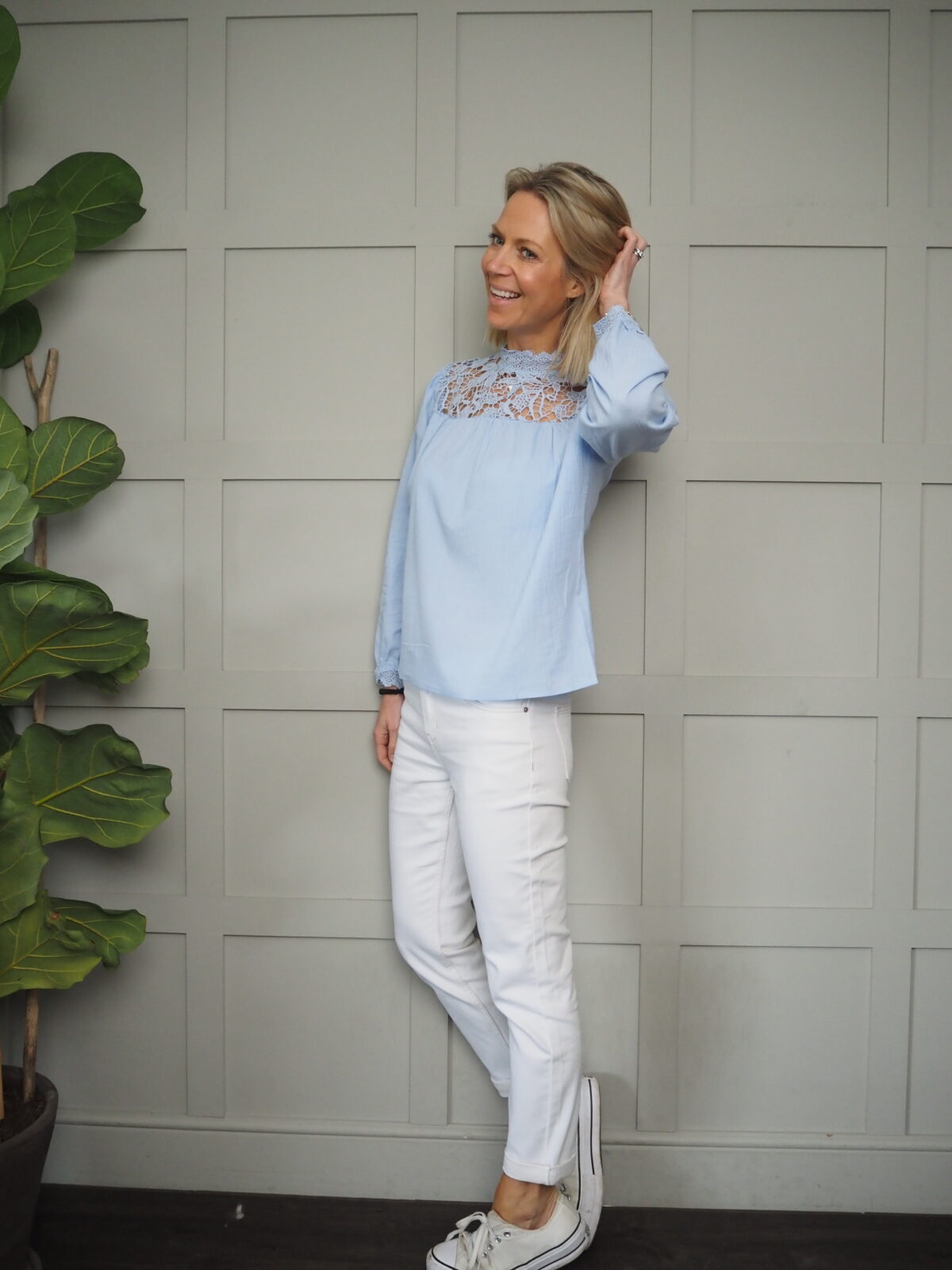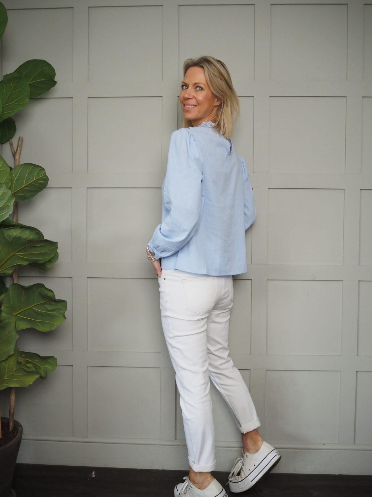 Light Blue worn with the Yaz jeans and Off White worn with the Katrina jeans.