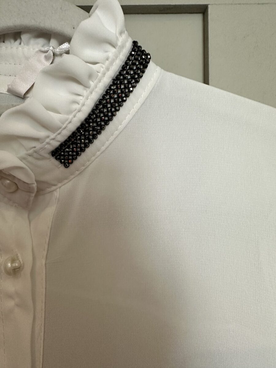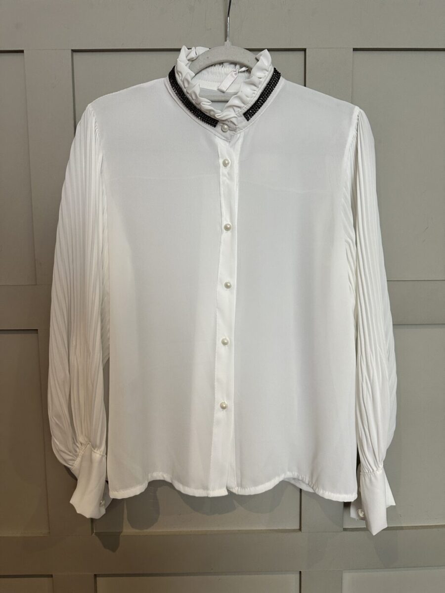 A beautiful blouse with gorgeous details – pleated sleeves, rhinestones on the collar and frill detail, pearl buttons to the front and two pearl buttons on the cuffs.