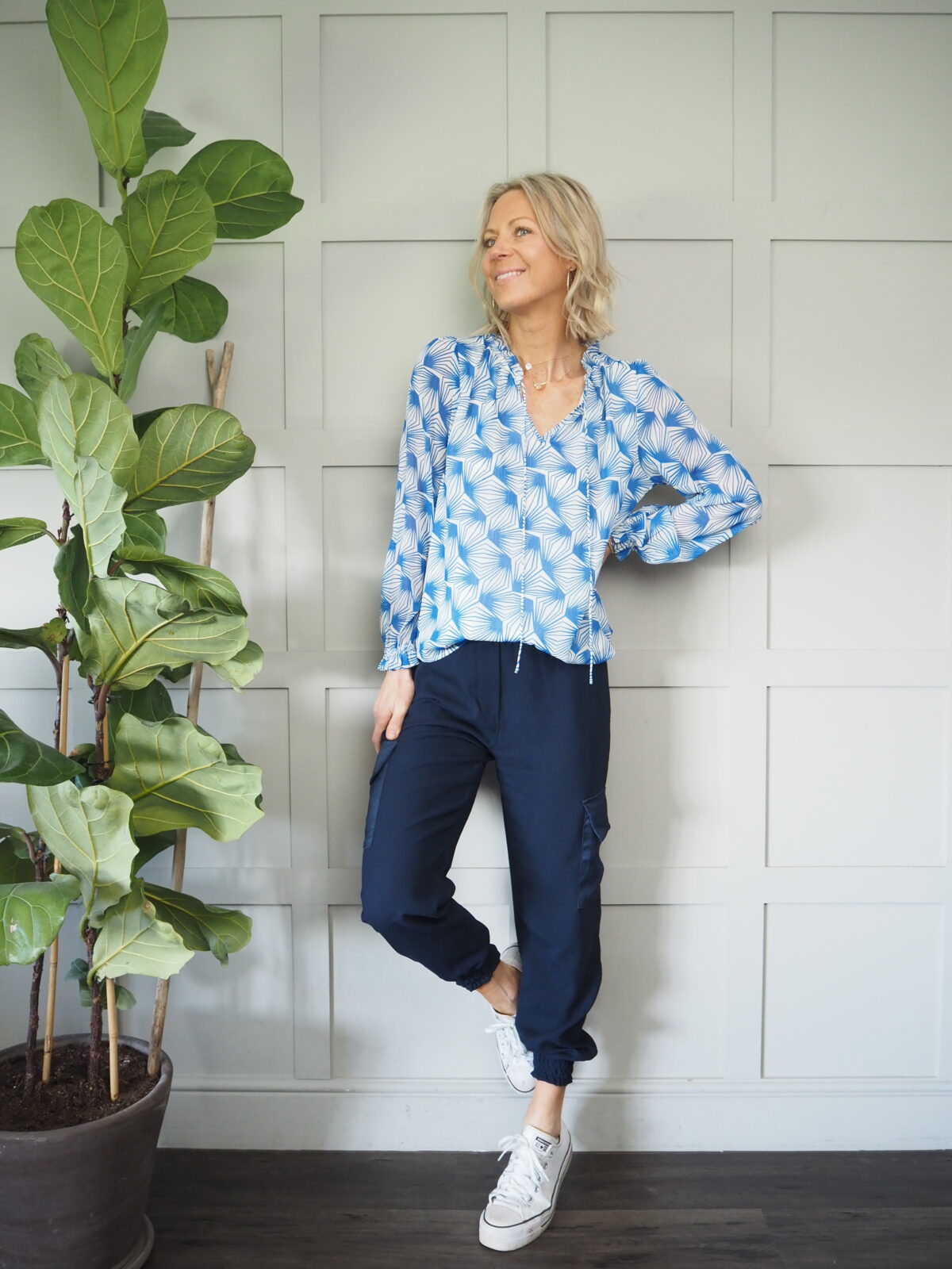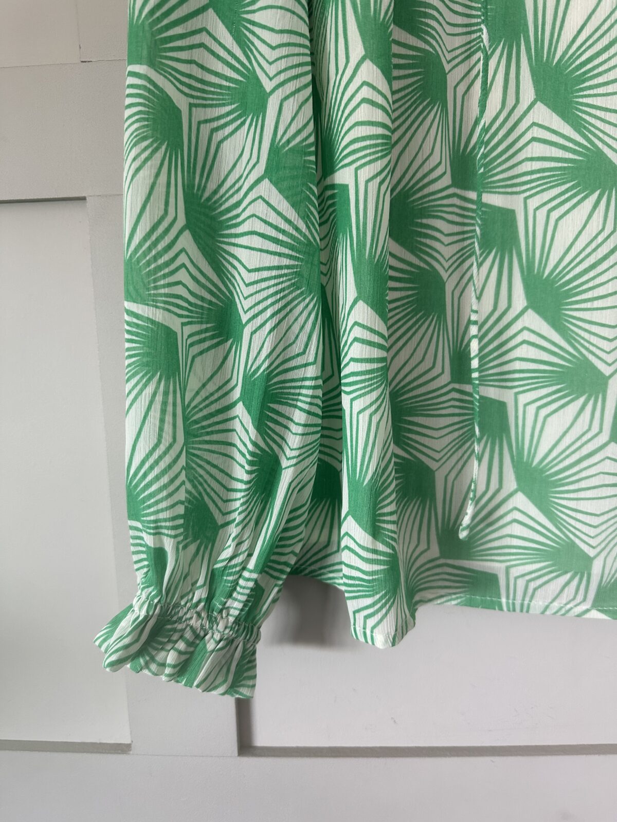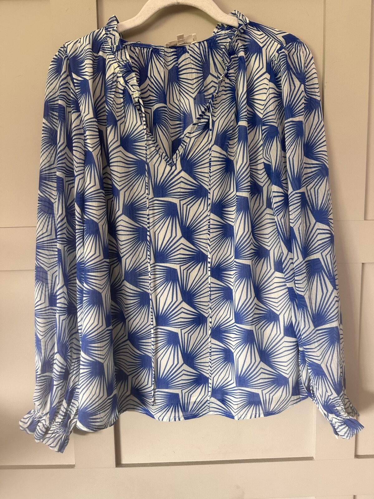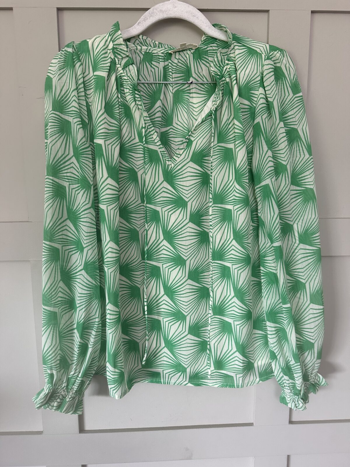 This floaty, lightweight blouse is perfect for the spring/summer. The blouse is V neck with a string tie and elasticated cuffs, filly collar and stunning geometric pattern with a touch of sparkle.