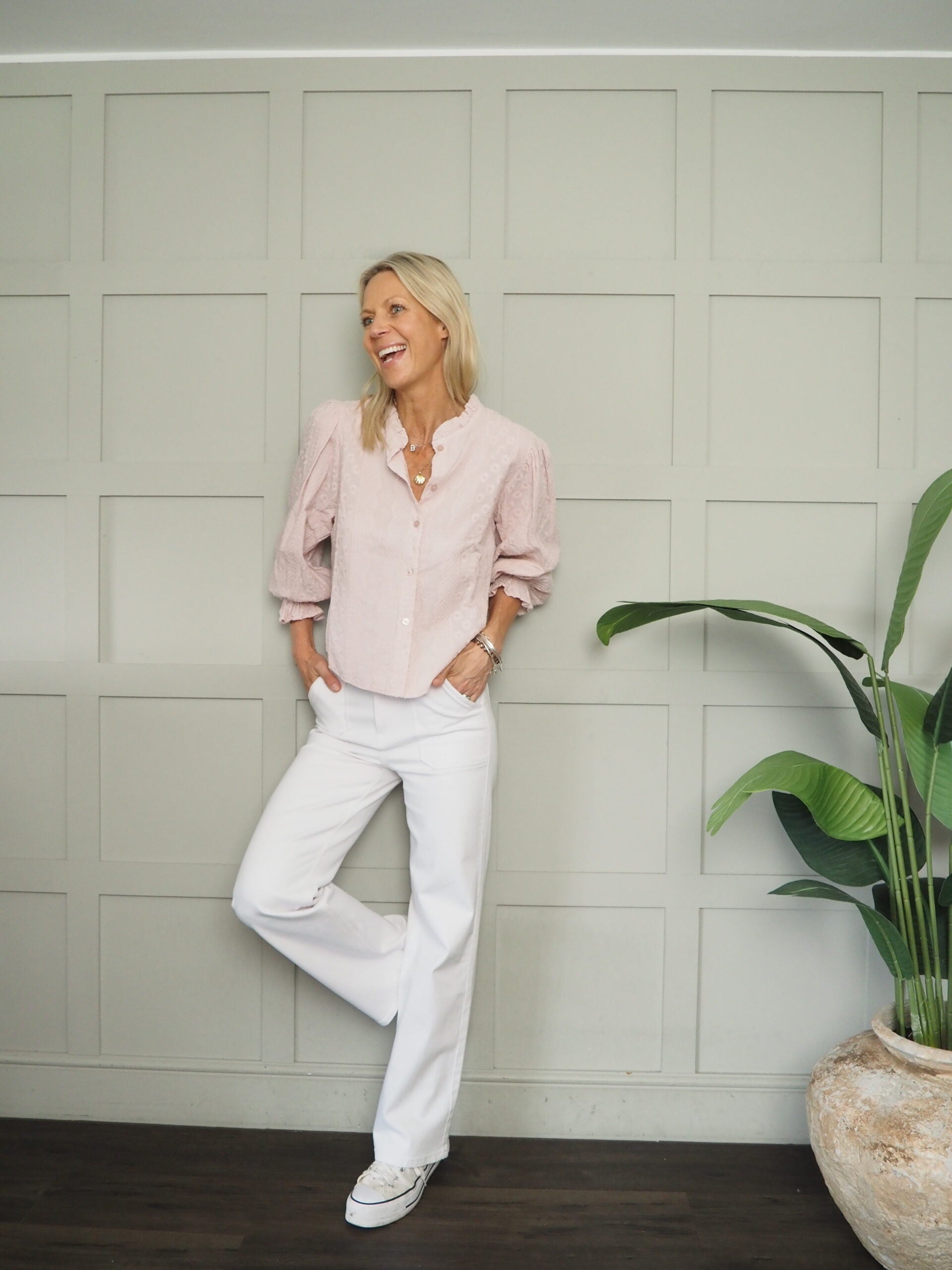 This pretty embroidered blouse has a small ruffle collar, cropped sleeves and elasticated cuffs. It is a boxy shape so works nicely worn untucked or tucked in.