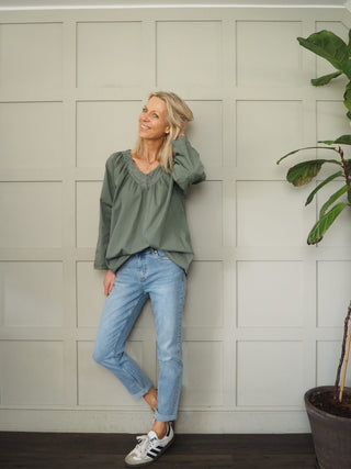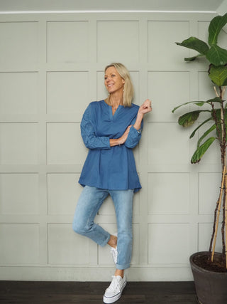 Rollo Tunic Style Long Sleeve Blouse with V Neck & Broderie Anglaise Detail - Denim Blue, Khaki, White