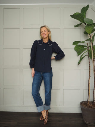 Cerise Long Sleeve Blouse with Ruffle Detail - Navy Blue, Off White