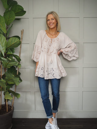Art Long Sleeve Blouse with Broderie Anglaise Collar and Tie Detail - Off White