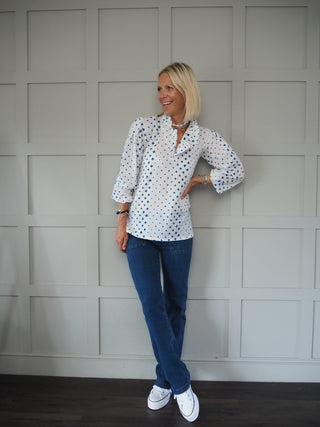 Diamond Long Sleeve Blouse with Ruffle Collar - Off White/Blue