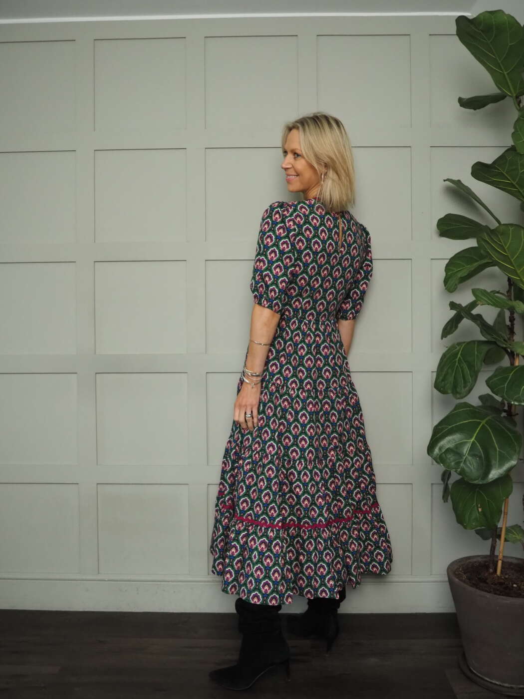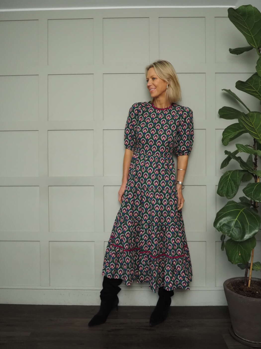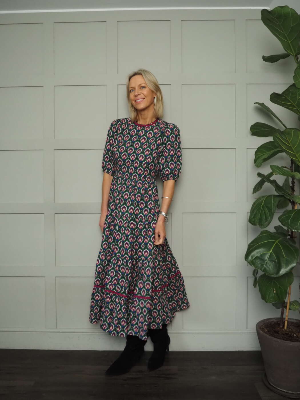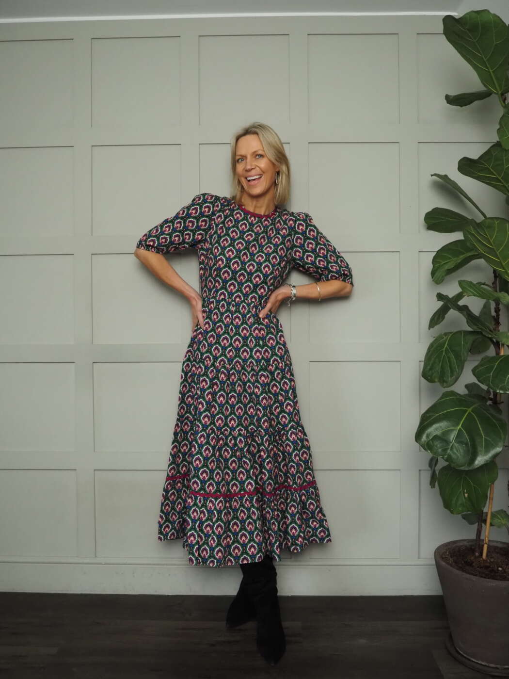 This fab dress is a 100% cotton poplin smock dress. Gorgeous quality with a side zip fastening, elbow length sleeves with elasticated cuffs, tiered maxi skirt and rick rack trim around the neckline and on one tier at the bottom of the skirt.