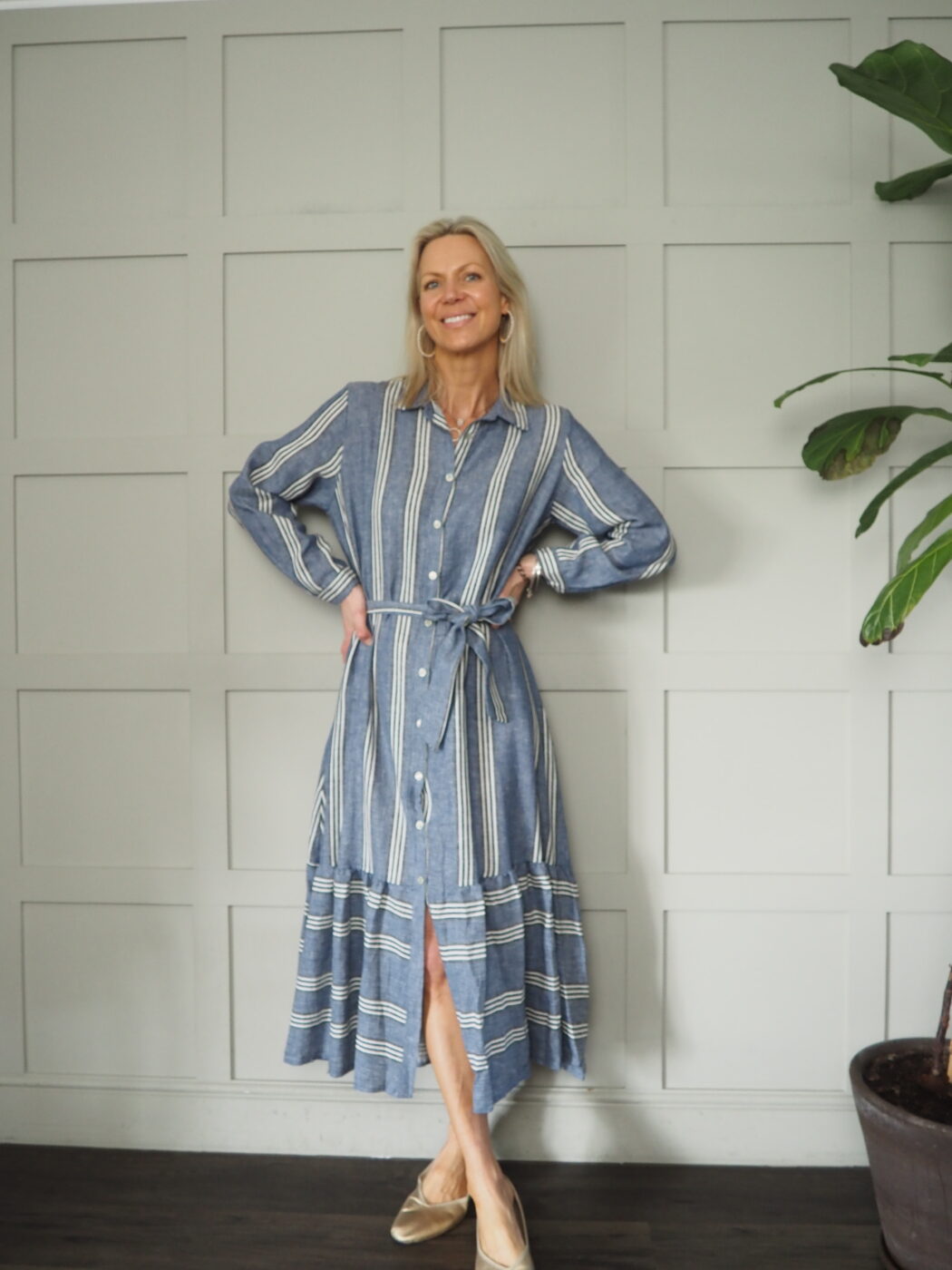 This linen mix shirt dress can be worn for so many occasions, it can be dressed casually with trainers or worn with pumps or heels for a smarter look. It has full length sleeves with button cuffs, a shirt collar, button fastening to the front, a detachable belt and a tier at the bottom of the dress.