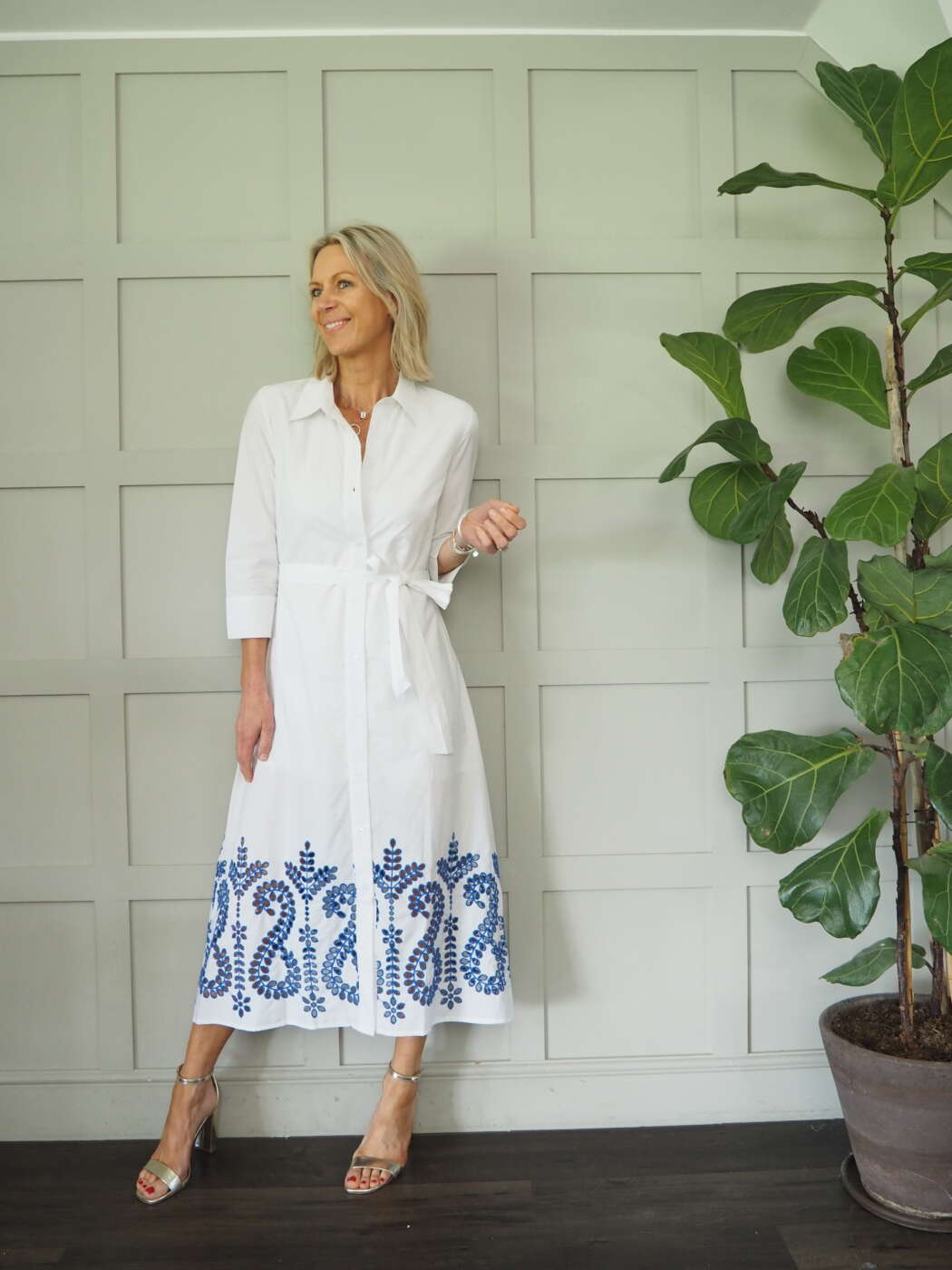 Fabulous shirt dress, with a gorgeous blue broderie anglaise detail on the skirt. Buttoned all the way down with a detachable belt, a collar and long sleeves. The skirt is lined to just above the knee . A very pretty, versatile piece for the summer which can be worn for lots of different occasions.