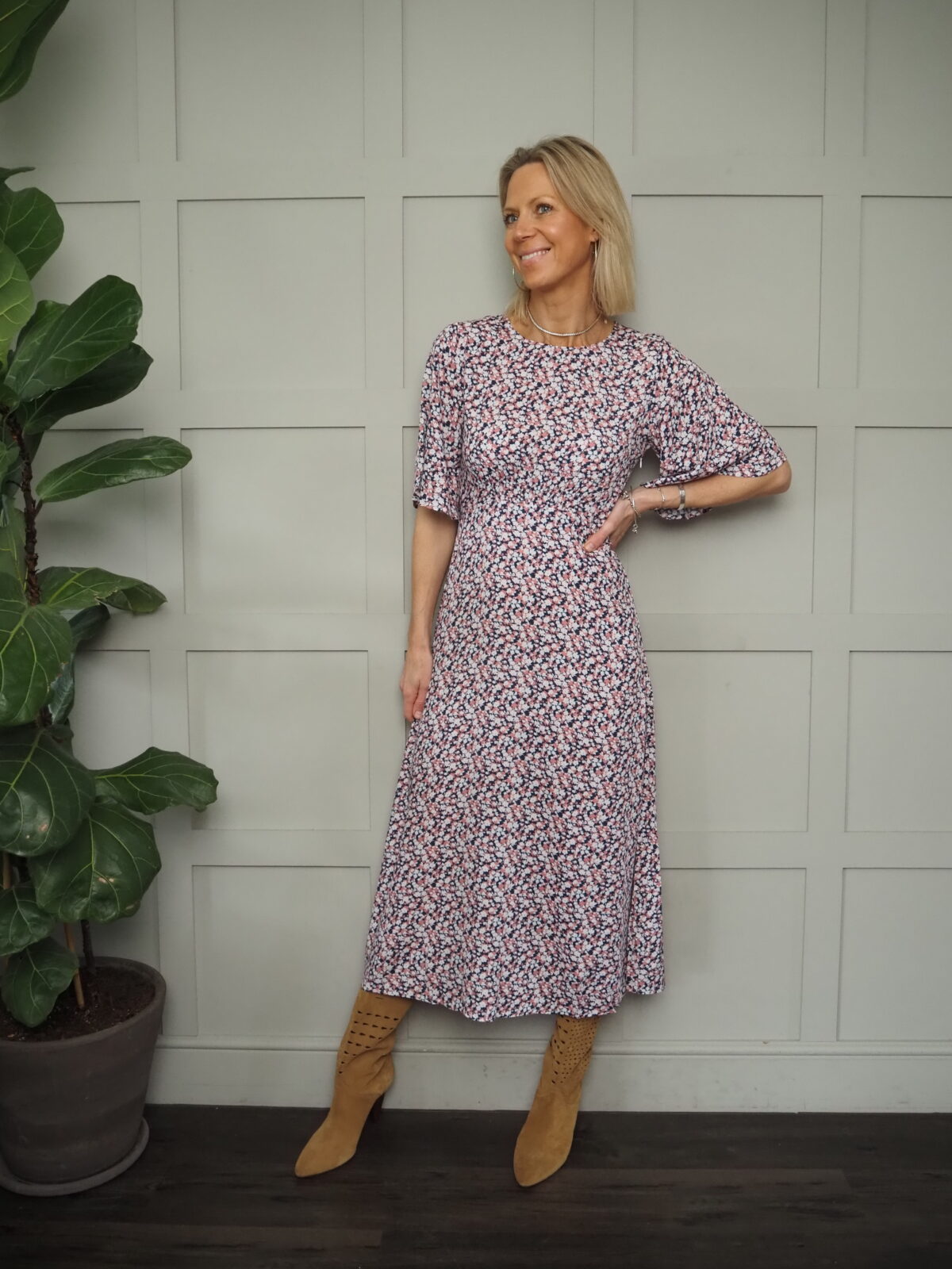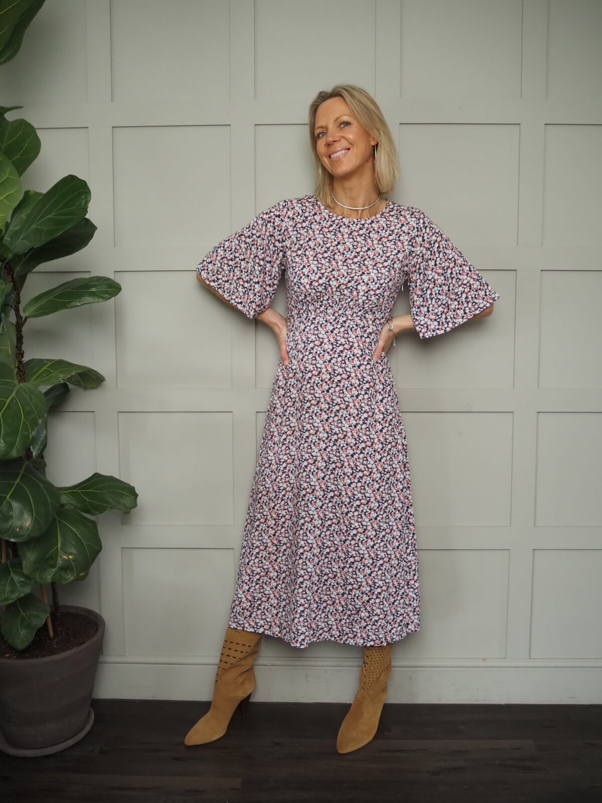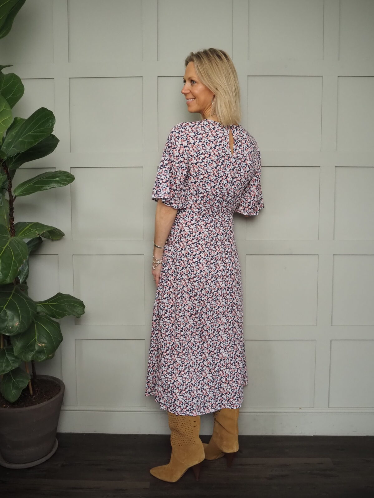 Ditsy floral print is a lightweight dress. Round neck, short angel sleeves, zip fastening at the side, elasticated detail under the bust. Button fastening at the back.