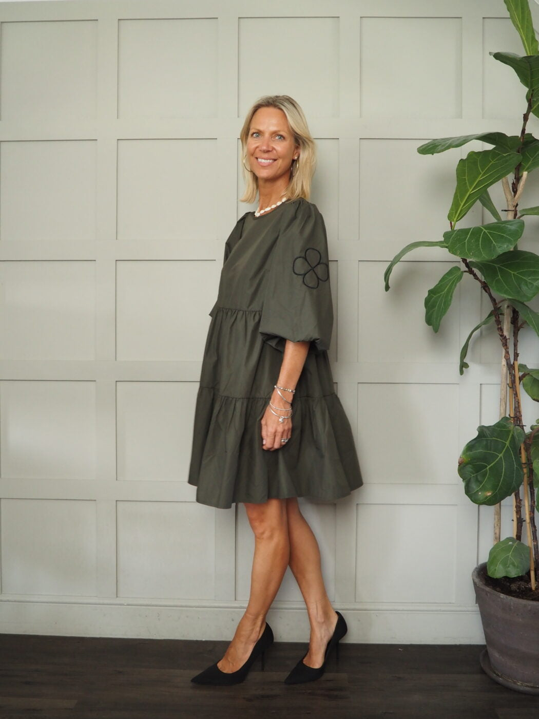 This beautiful dress by the Danish brand, Costa and Mani, would be a fantastic addition to your wardrobe. It features fabulous balloon, elbow length sleeves which are wide but have elasticated cuffs. There is a cute black embroidered 4-leaf clover motif on each sleeve. Round necked and there is a single button at the back of the neck. This dress is tiered and would work on lots of different heights. It can be styled in different ways, worn casually with trainers, dressed up with heels or worn in colder weather with tights and boots.