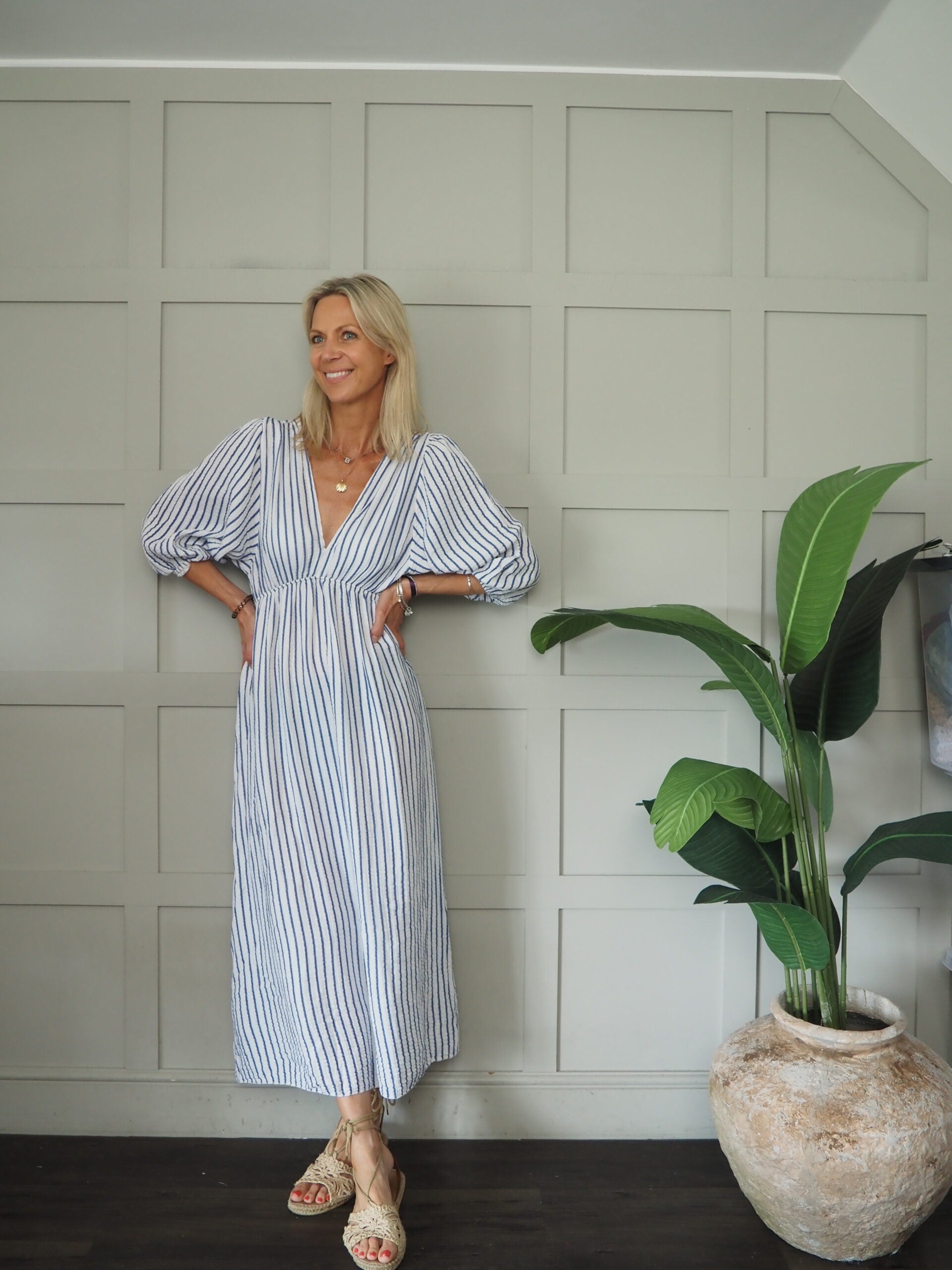 The Pippin striped cheesecloth dress, has cropped, balloon sleeves with elasticated cuffs, a v neck at the front and a v neck with a tie detail at the back which can be tied tighter or loser to suit your size. The waistline is elasticated making it very comfortable. A fun, cool and easy to wear piece for the summer.