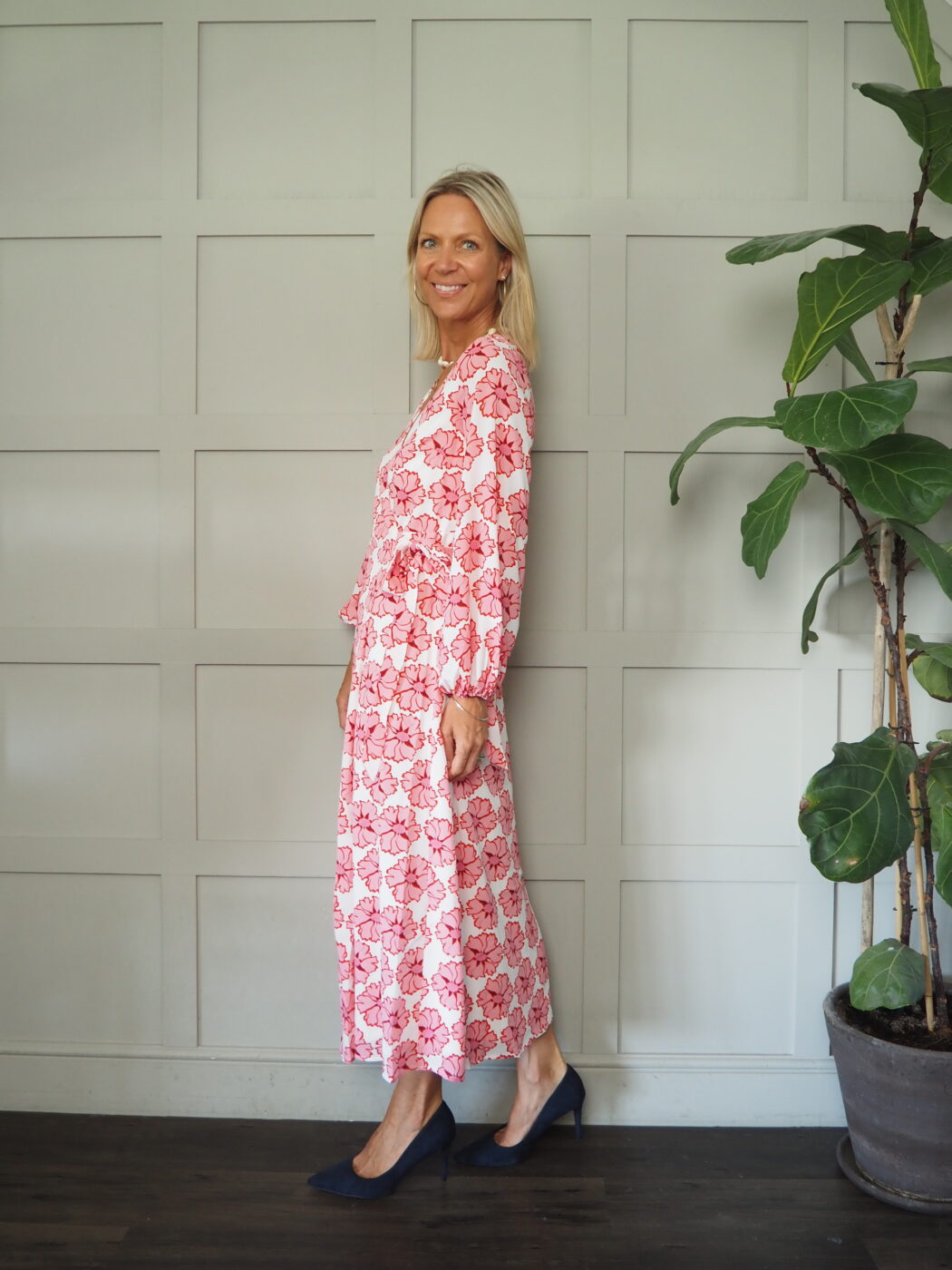 Pretty v neck wrap over dress with full length sleeves with elasticated cuffs and a tie belt that wraps around the waist. This can be worn dressed up with heels or casually with trainers.