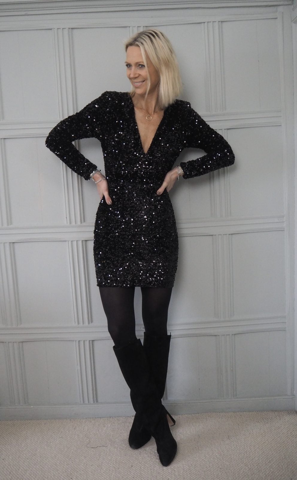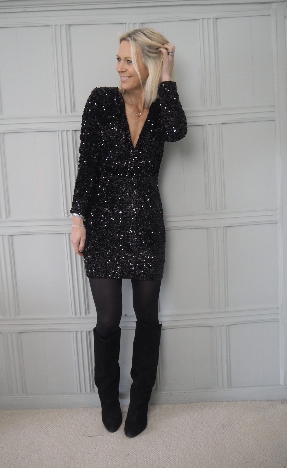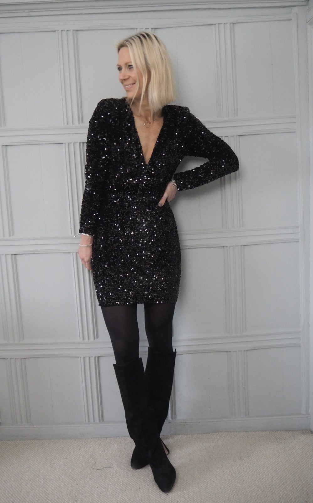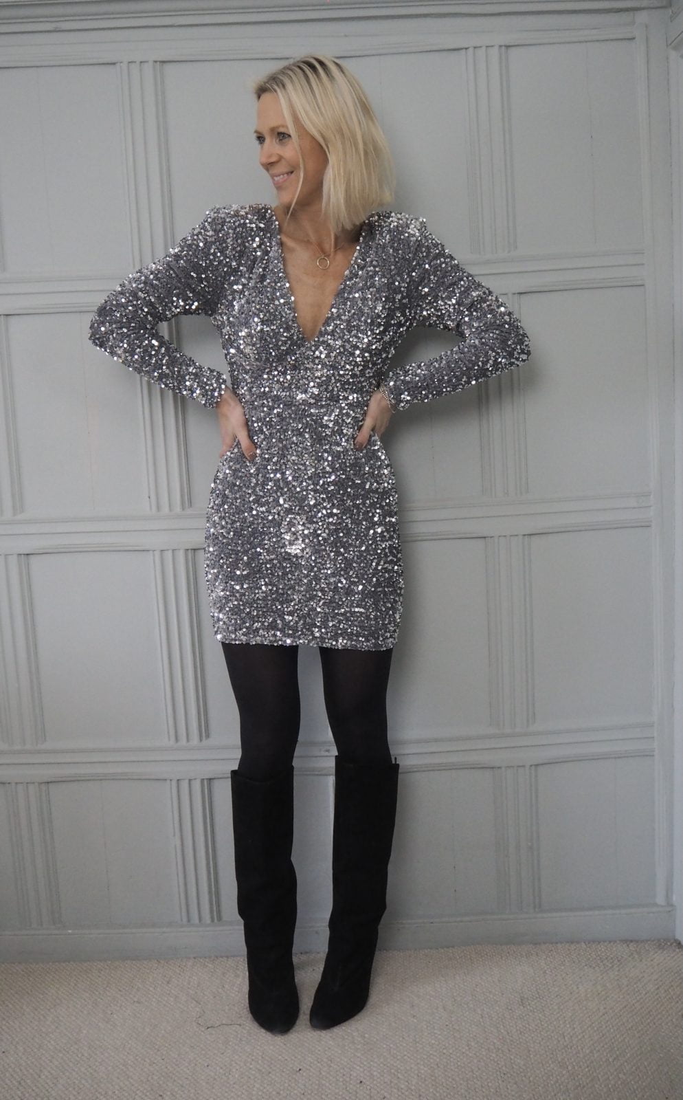 Stunning sequin dress which is fully lined. It has long sleeves, a deep v-neck and zip fastening at the back.