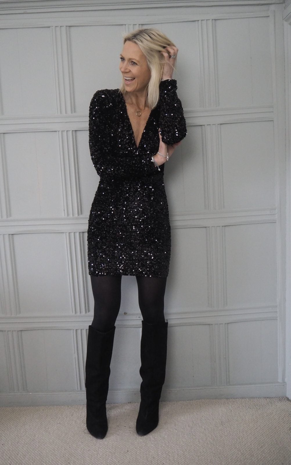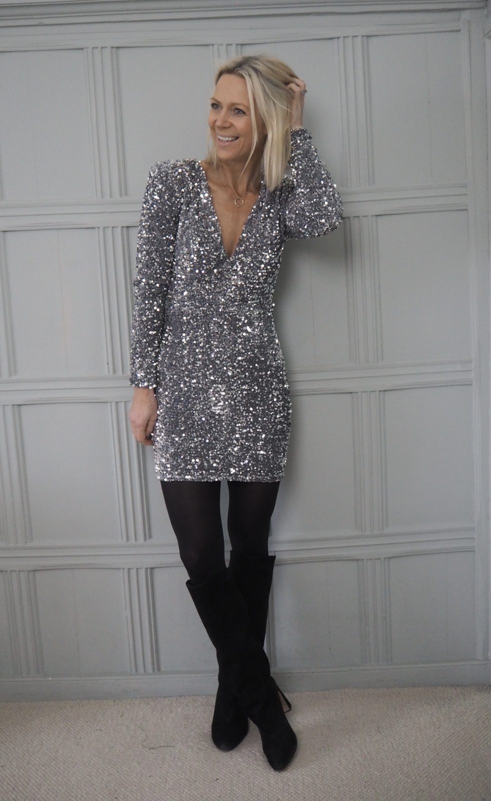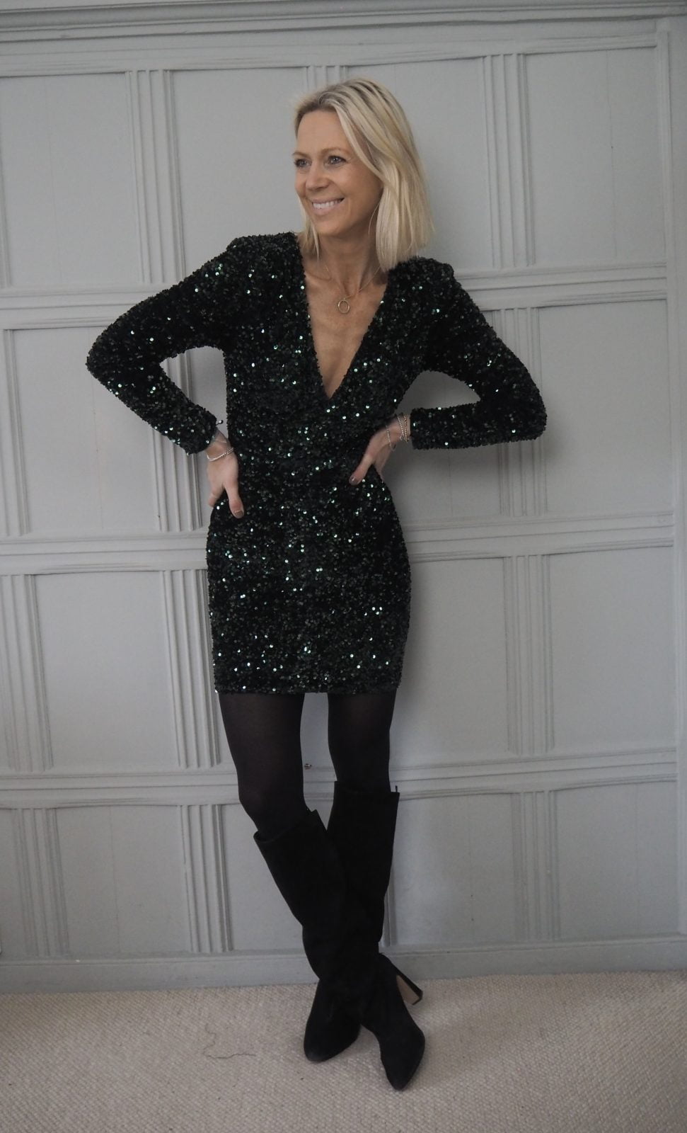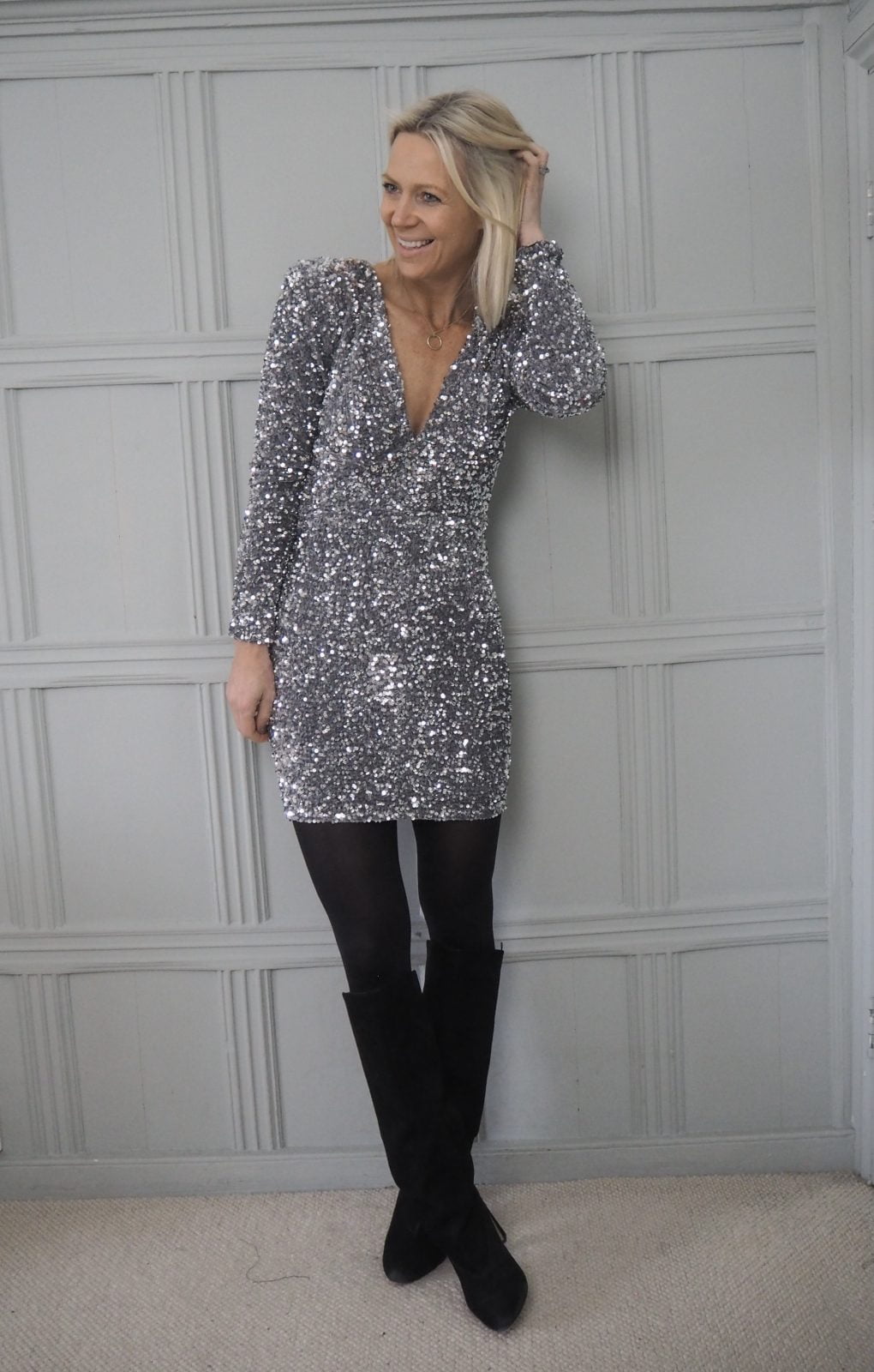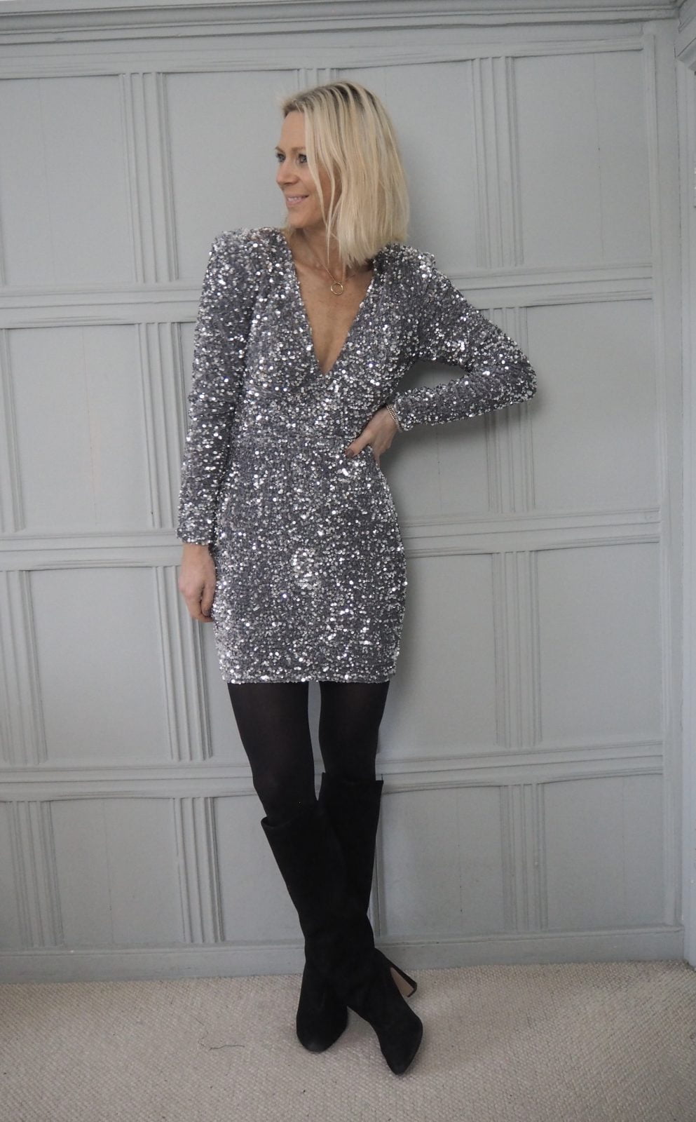 Stunning sequin dress which is fully lined. It has long sleeves, a deep v-neck and zip fastening at the back.