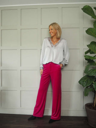 Neava Long Sleeve Lace Trimmed, Satin Feel Top - 11 Colours