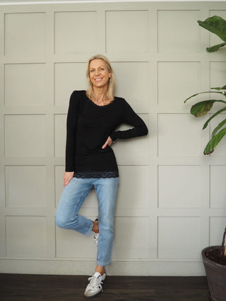 Frances Long Sleeve Long Line Top with Lace Detail - Black, Navy Blue, White