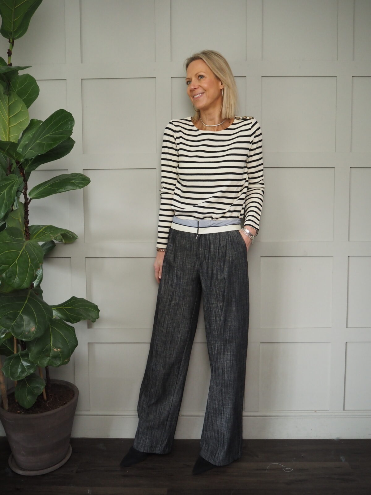 Worn with the Wispa Cotton Wide Leg Trousers with Stripy & Cream Waistband – Black.
